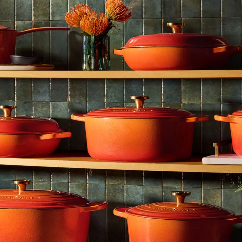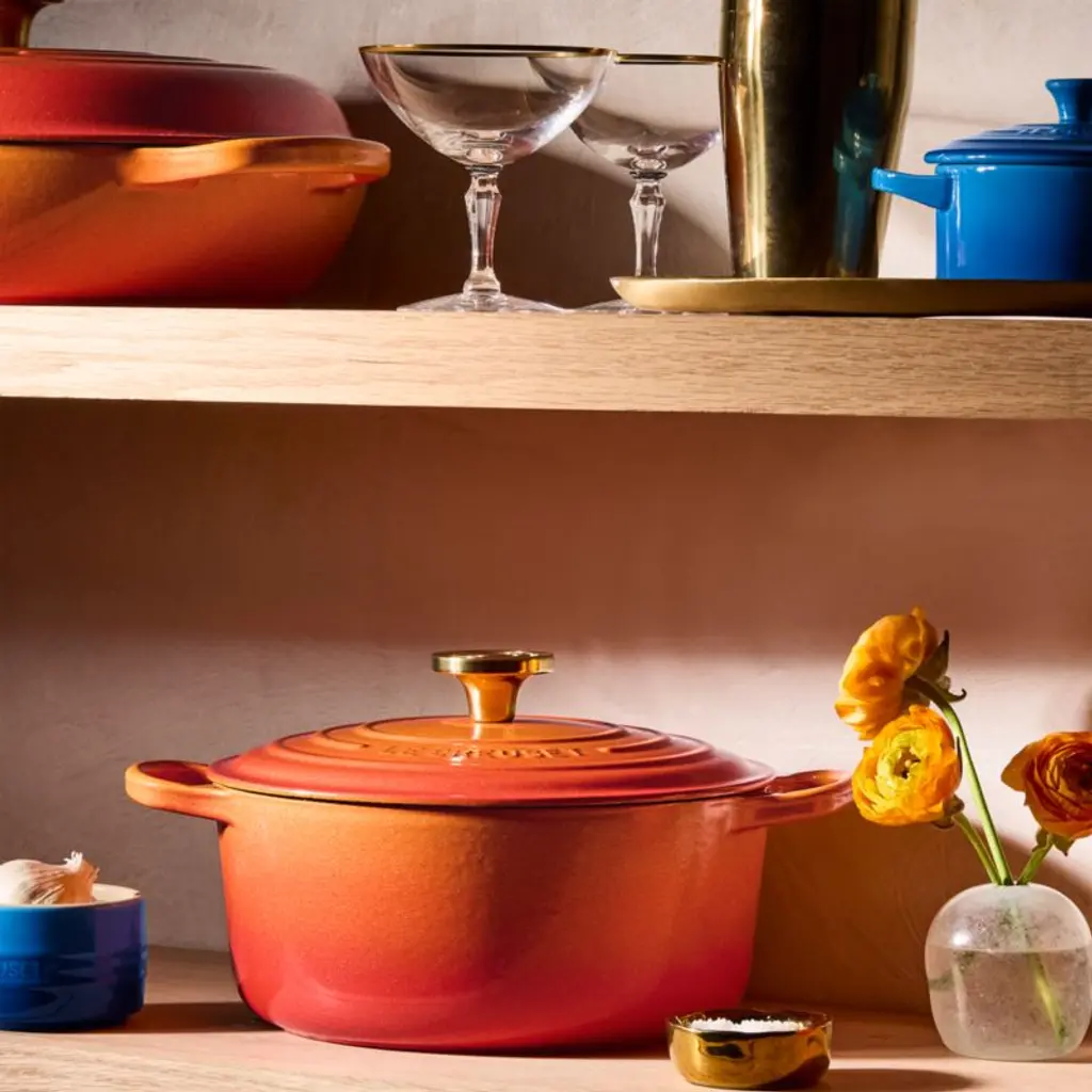 Le Creuset turns up the heat to celebrate its 100th anniversary year with Flamme Doree ("golden flame") a special edition of its iconic Flame cast iron cookware. Adding to the dynamic look of the trademark ombre red-orange enamel finish in fiery shades of molten iron, a gold knob tops the pot lids with a graphic pattern inspired by a crucible gripped by tongs. The round Dutch oven maintains even and consistent heat and has a smooth interior that promotes caramelization, resists stains and prevents sticking for easy cleanup. The close-fitting lid creates a blanket of heat for even cooking.Revered by both professional chefs and home cooks since its 1925 debut, Le Creuset's classic French cookware is prized for its utilitarian beauty and unsurpassed heat retention.