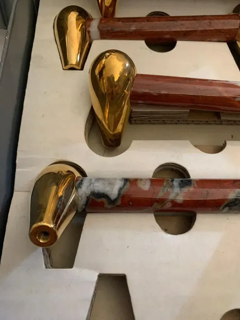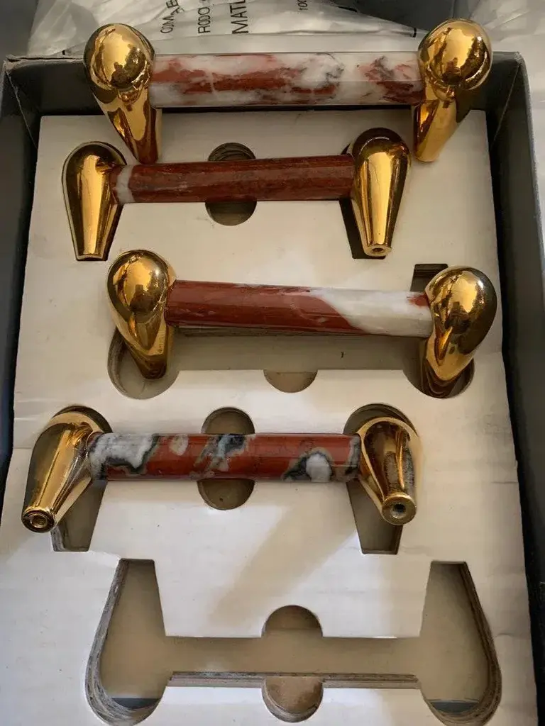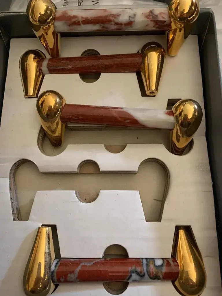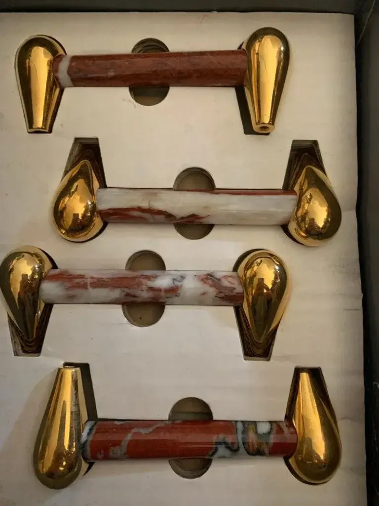 Two pairs of beautiful door knobs White and red marble handmade - round. These exquisite round marble handles are handmade have been carved and produced in Italy Brass bushings to be fixed with white marble insert Each handle is made with a random selection of marble, so each handle is totally unique. All made in Italy, ship from Italy legnht: 12 cm = 4.72" height 4.5 cm = 1.7"