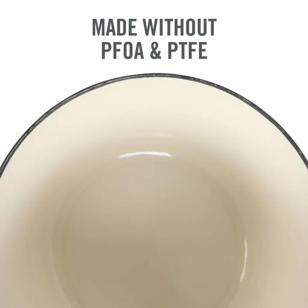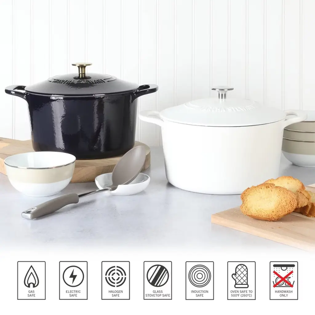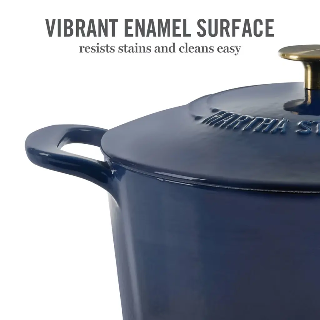 The Martha Stewart Gatwick 7-quart Enameled Cast Iron Dutch Oven with Lid provides versatility and durability while making all kinds of delicious recipes every day. Crafted from durable cast iron, this piece distributes and retains heat evenly to slow cook stews, braise meats, bake casseroles, and more. The vibrant enamel finish resists stains for elegant presentation and easy cleanup. Sturdy handles offer balance and support when serving from oven to table. The lid has raised grooves to redirect moisture back on the food for tender, flavorful results. Safe in the oven (up to 450°F) and on all cooking surfaces, including induction stoves, this Dutch oven offers style and performance to inspire any home cook to explore and do more in the kitchen. Hand wash only.Embrace thoughtfully designed home essentials from America’s most trusted lifestyle expert, Martha Stewart. Step into her exquisite and iconic world filled with a curation of high-quality products to prep, cook, bake, serve, and enjoy. All crafted to elevate everyday homemaking and seasonal entertaining, these kitchen and tabletop pieces blend style and performance, inspiring avid hosts and home cooks to set stylish tables, serve up delicious meals, and create spectacular memories.