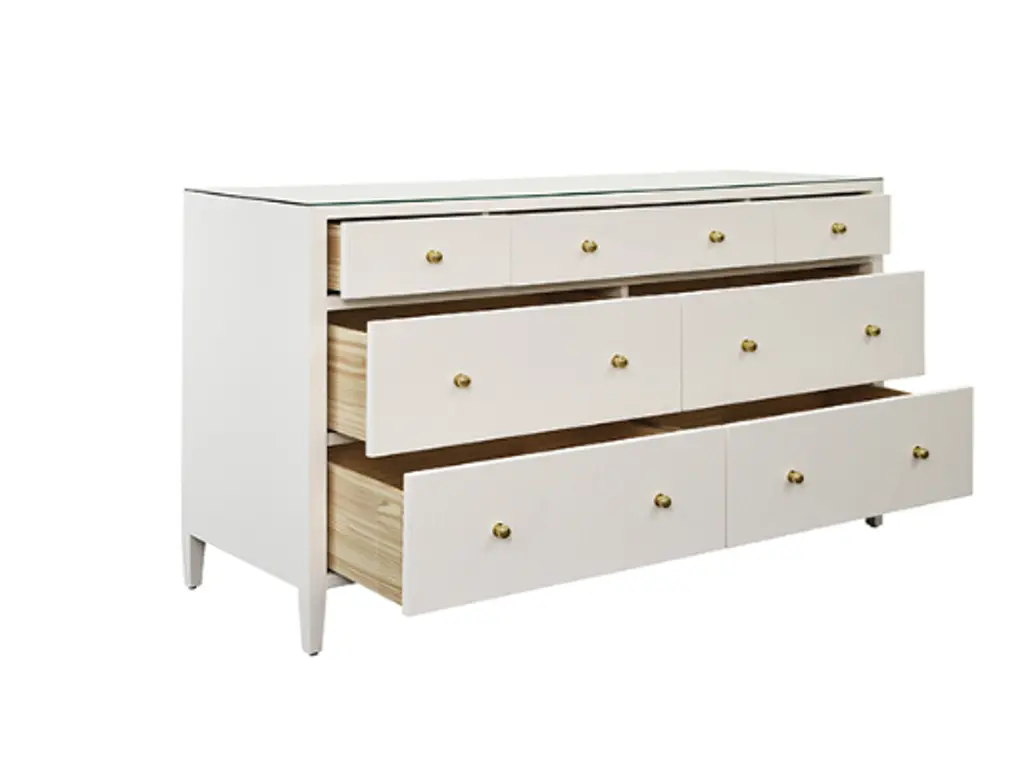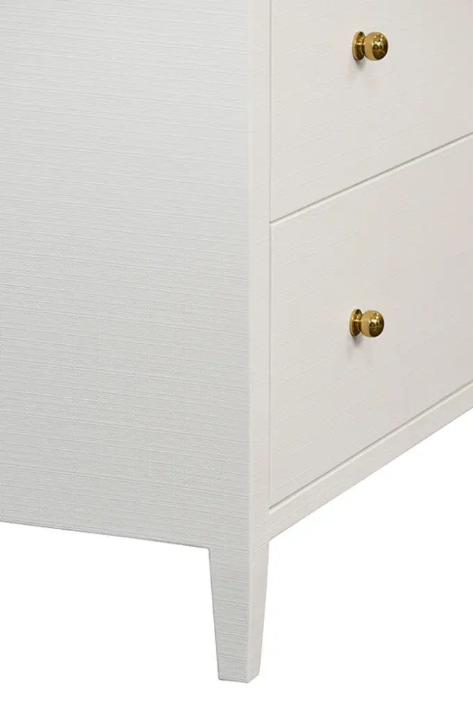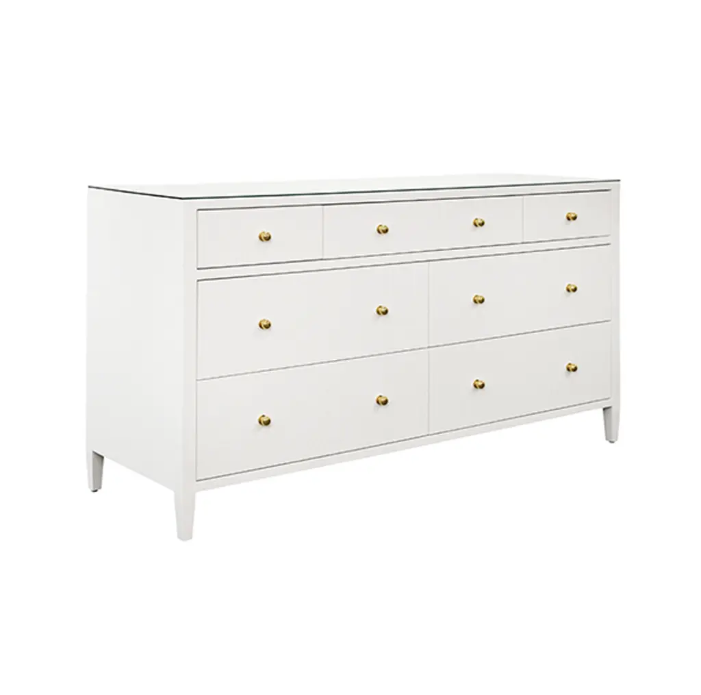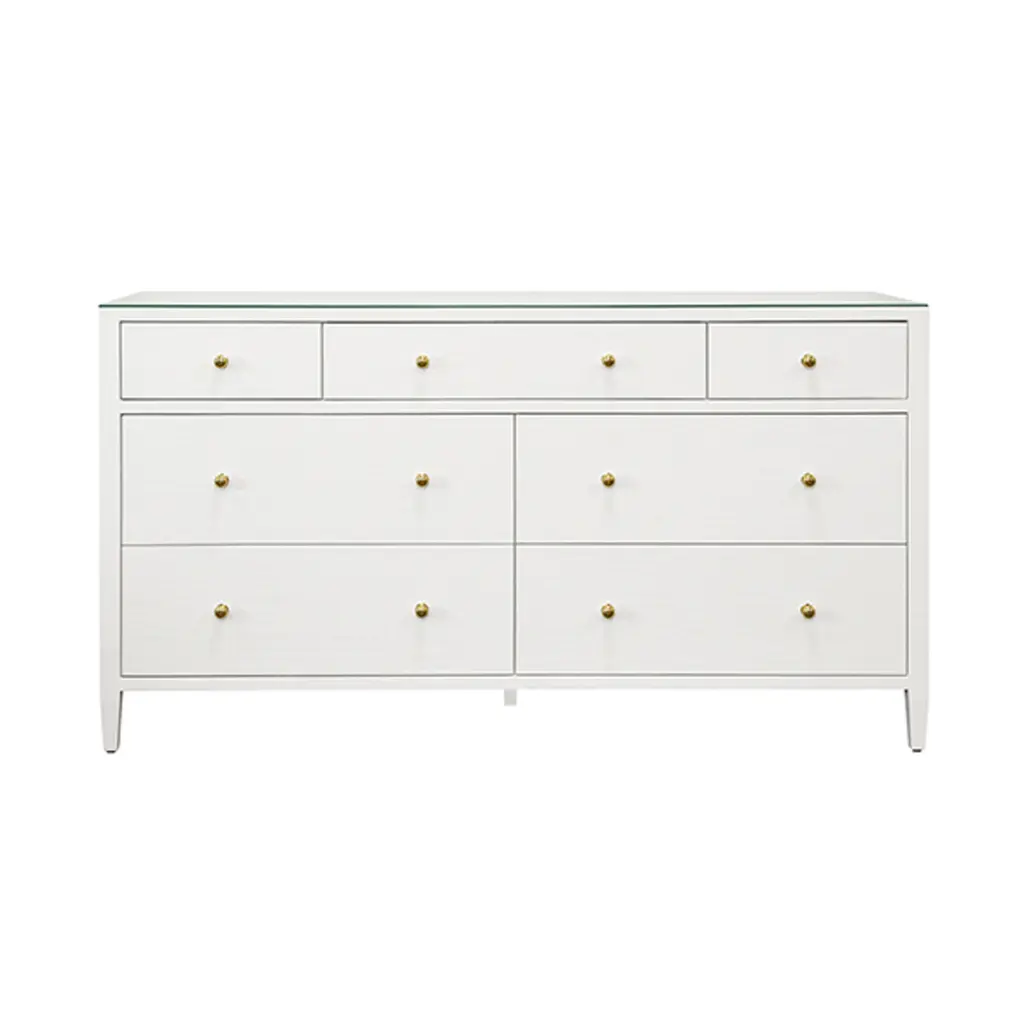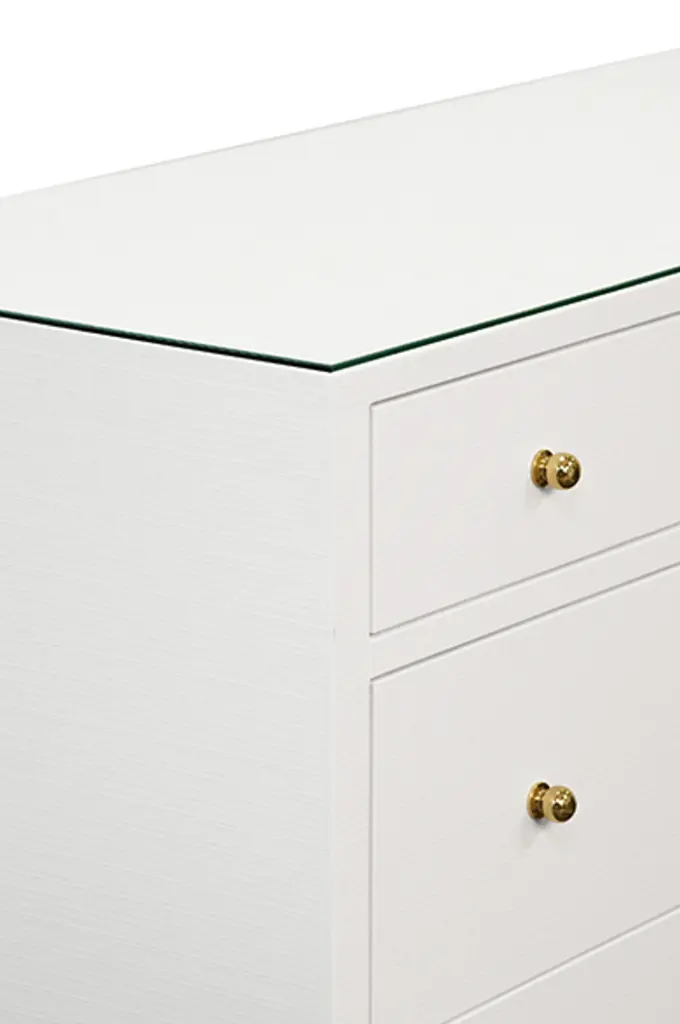 Matthew Izzo Home - Carnegie Textured White Linen, Glass Top, Seven Drawer Chest With Brass Knobs
