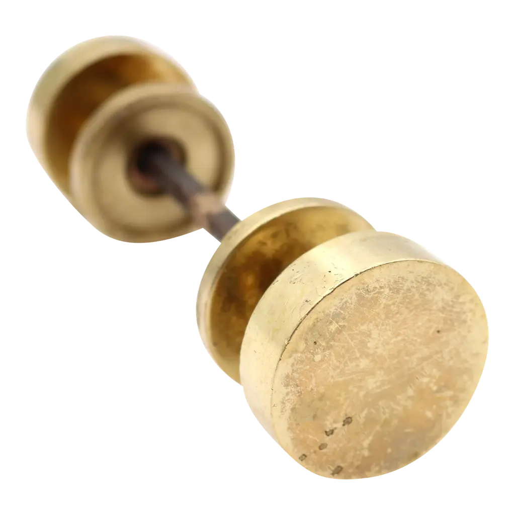 This set features round flat fronted wooden knobs with a cast iron shank. Each knob has been restored, preserving its original charm and character. They are in good refurbished condition. Priced per pair of knobs with a spindle. Wood tones may vary. The manufacturer and exact date of creation are unknown. The dimensions are 2.25 in. diameter x 2.125 in. D.