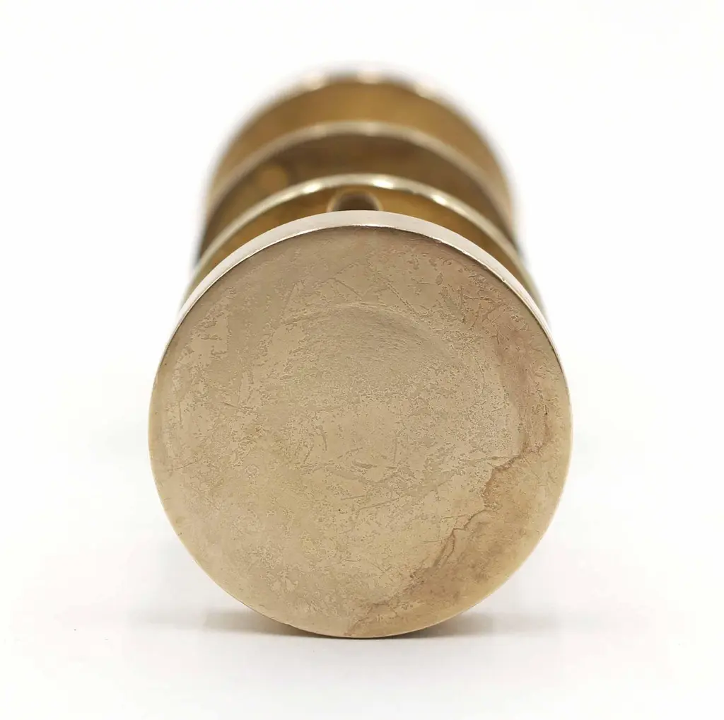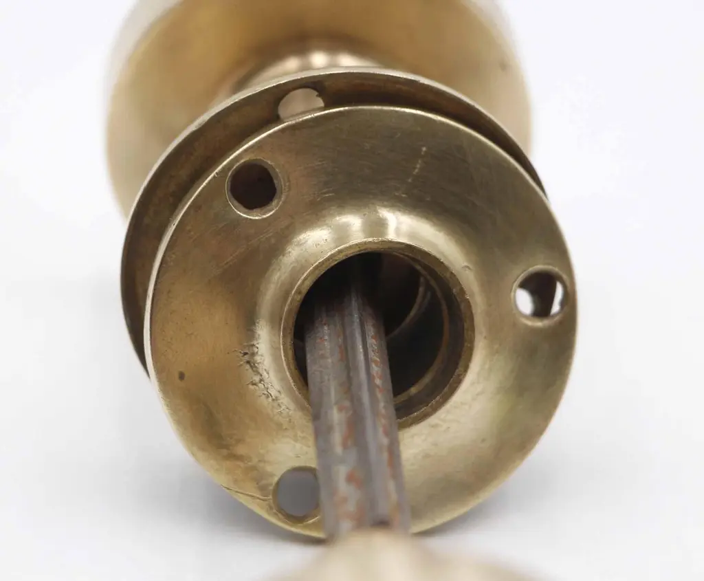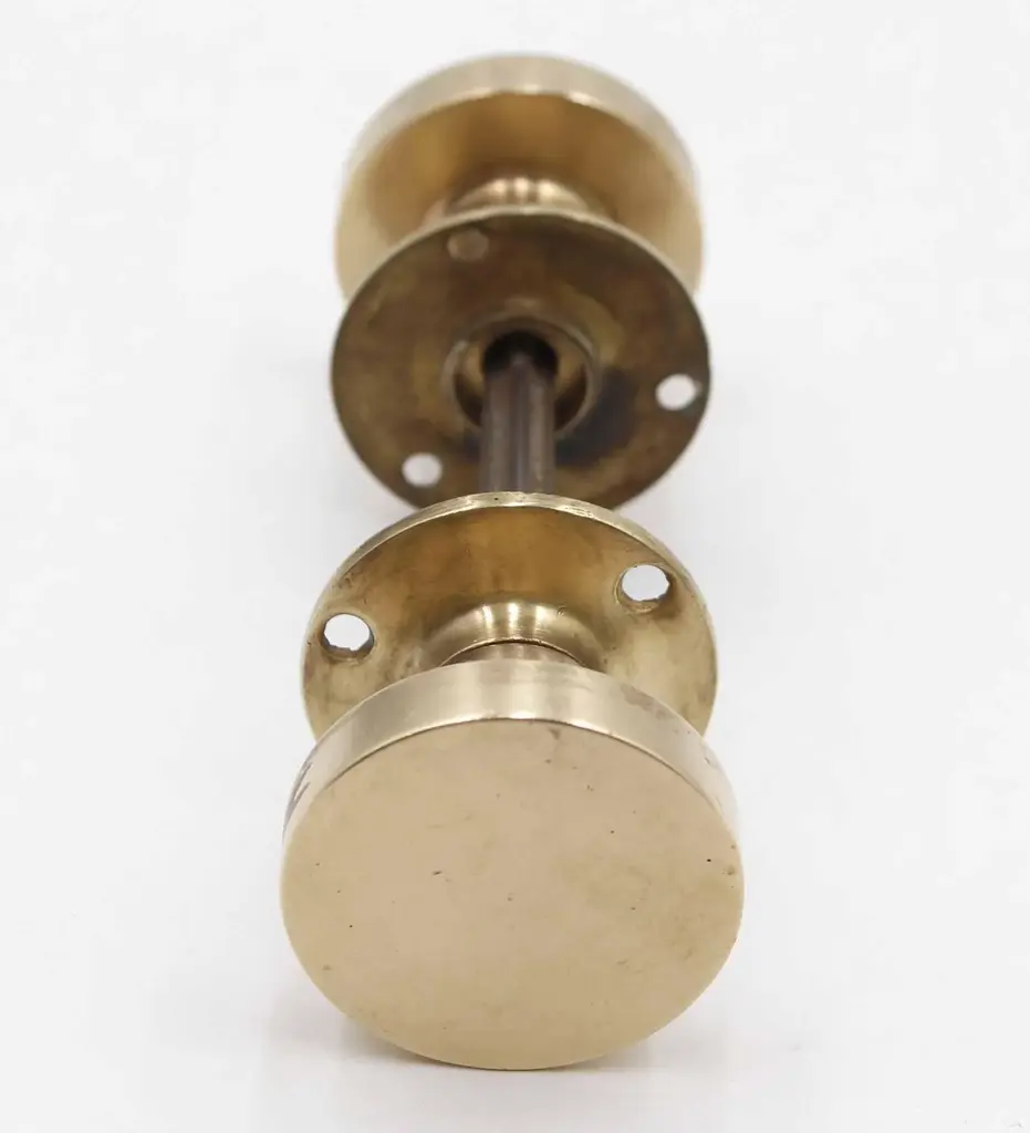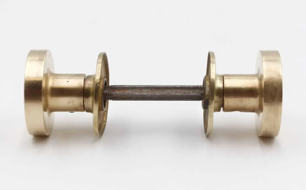 Reclaimed Modern style door knob set made of brass with a brushed finish. The door knobs are round in shape with a flat face. The original mounting screws are not available. Priced as two door knobs, two rosettes, and a spindle. Good condition with surface wear from prior use. Priced each. The manufacturer and exact date of creation are unknown. The dimensions are 2 in. diameter x 1.75 in. D, rosette 2 in. diameter x 0.375 in. D.