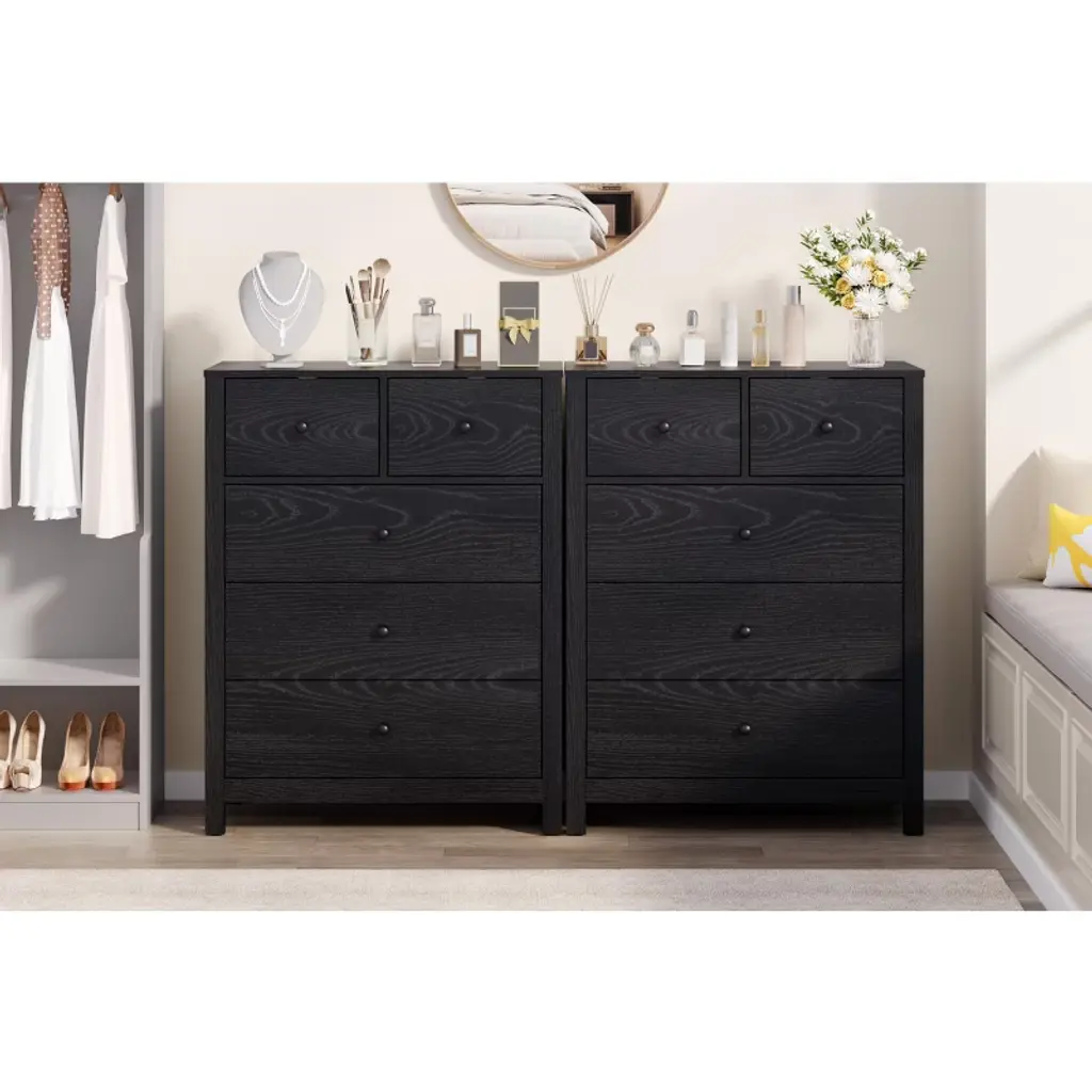 5 Drawer Dresser: This contemporary dresser measures 15.6"D x 29"W x 37"H and features 5 spacious drawers, each with a depth of 5.5 inches. It¡¯s perfect for organizing clothing, documents, jewelry, and personal belongings. The expansive tabletop offers ample space for lamps, picture frames, plants, and decorative accents. Streamline your living area, keep things tidy, and add a touch of warmth to your room