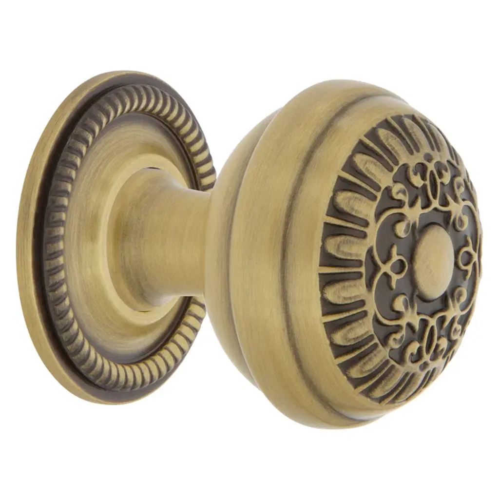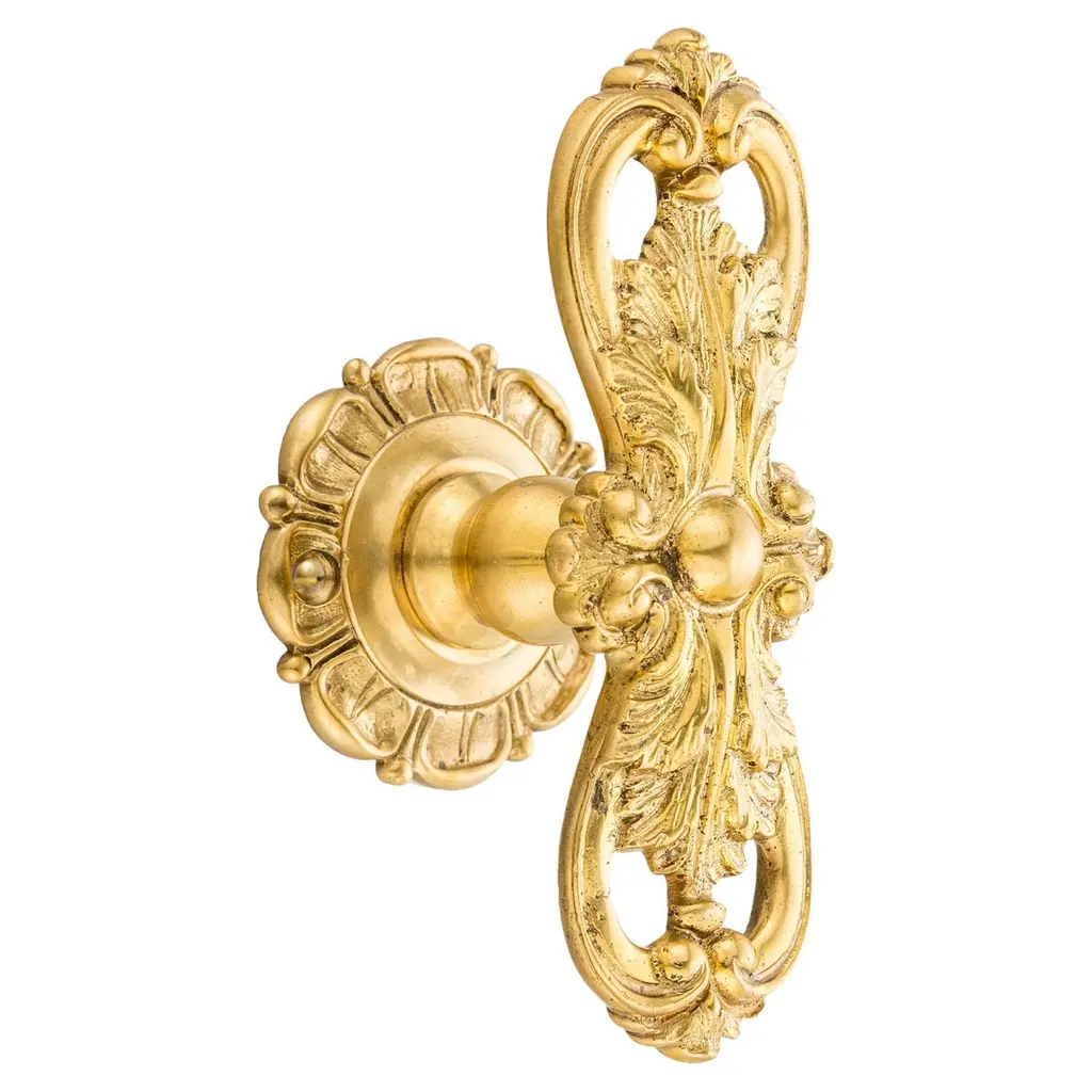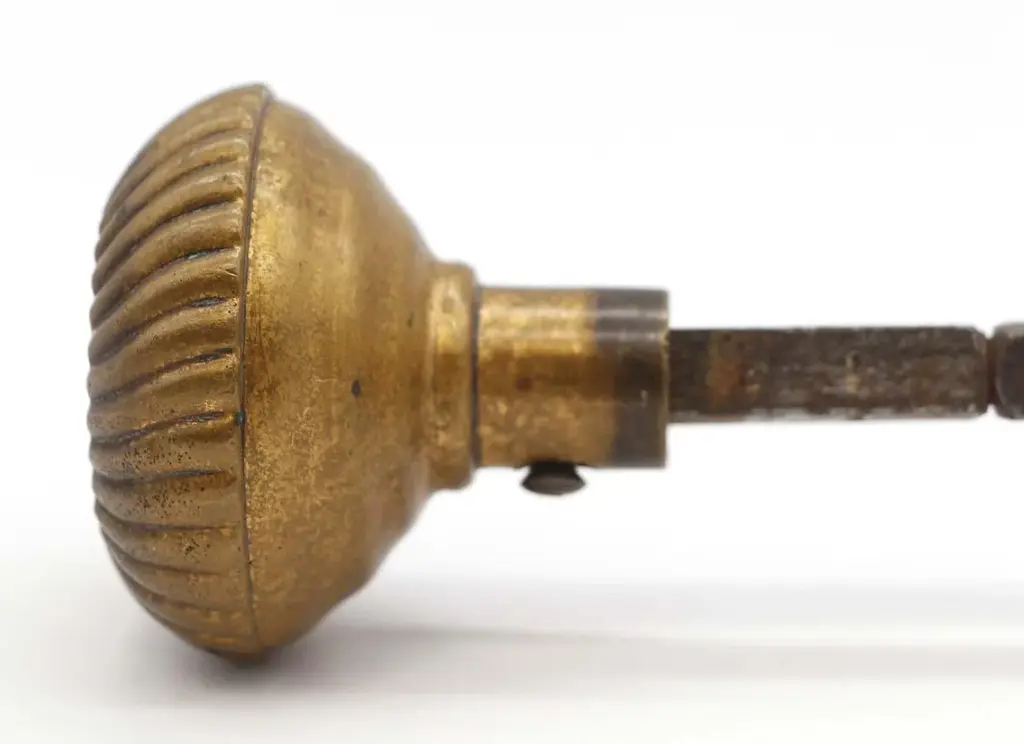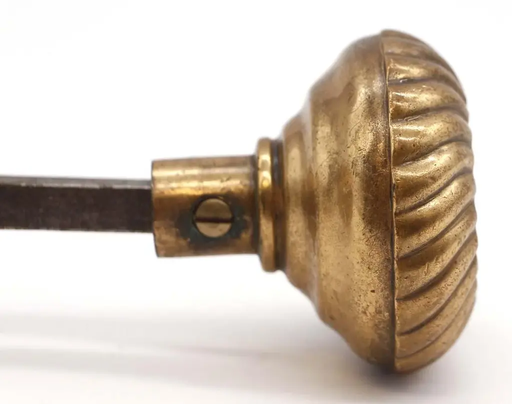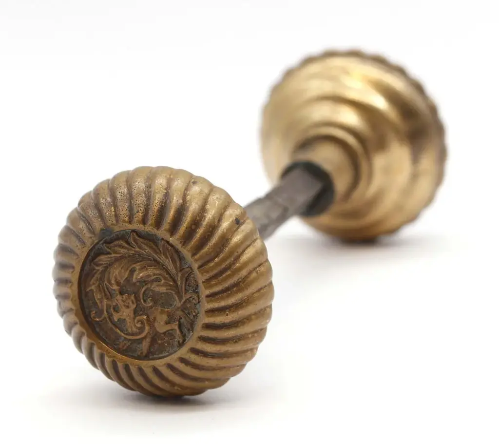 These Representational style asymmetrical knobs were made by P & F Corbin in the 1890 catalog. It is part of the B-21710 Empire group, Fanciful Beast. Good condition with appropriate wear from age. Priced as a pair of knobs and a spindle. The dimensions are 2.5 in. diameter x 2.5 in. D, 2.25 in. diameter x 2.375 in. D.