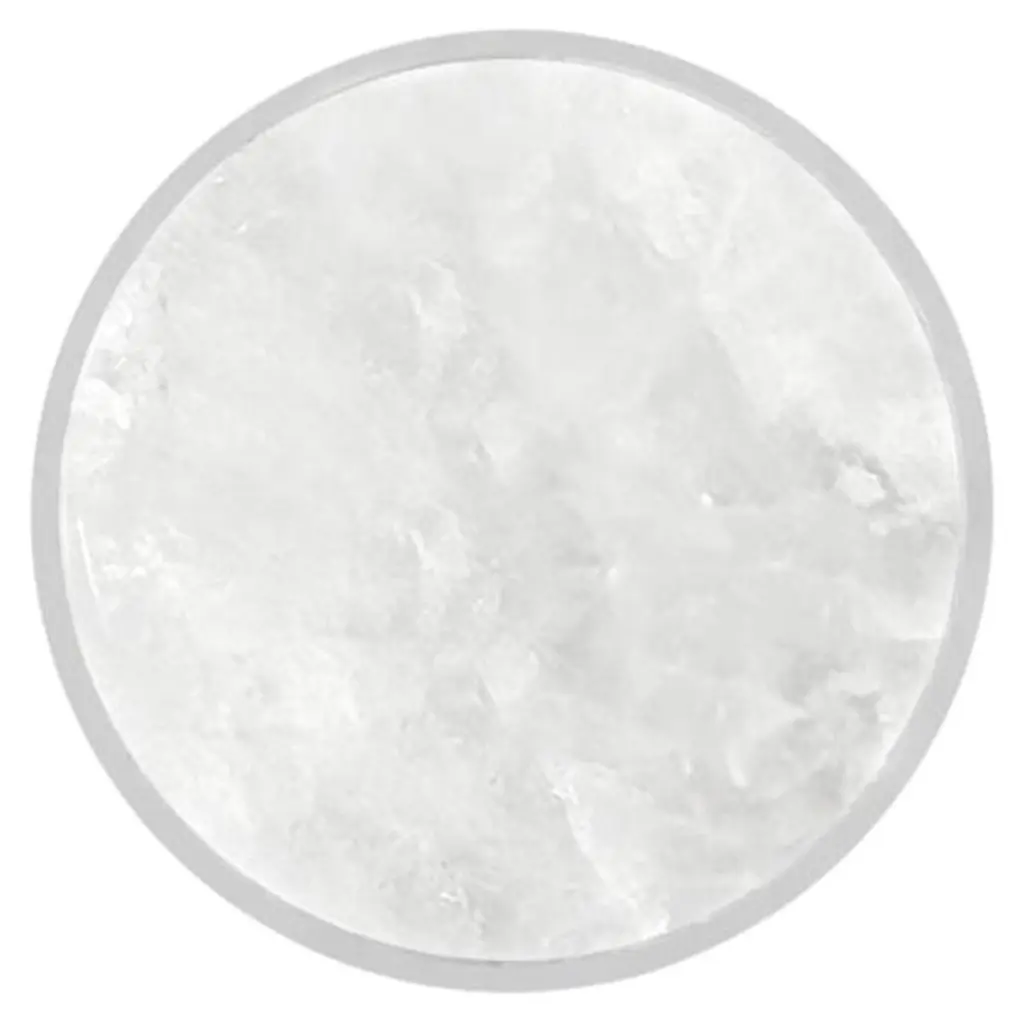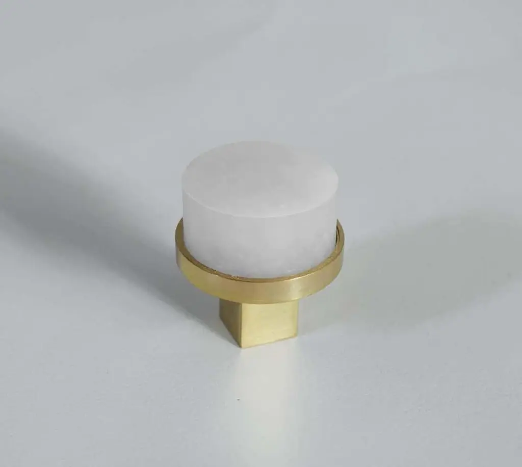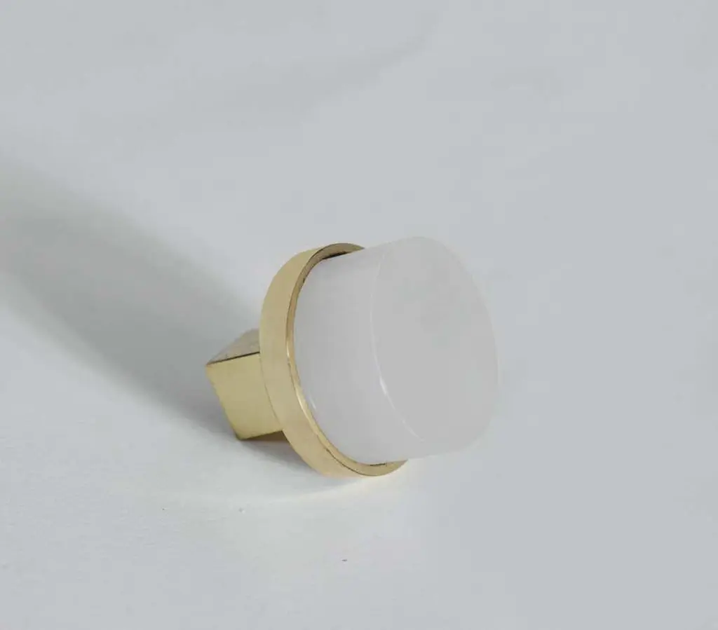Circular form rock crystal quartz knob with polished brass base. Created by Phoenix Gallery, NYC.Custom size and finish upon request.