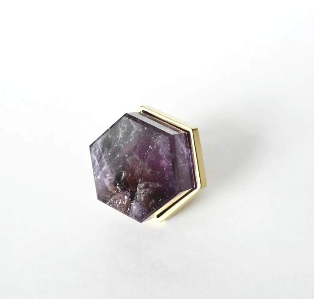 Hexagon form amethyst knob with polished brass base. Created by Phoenix Gallery, NYC.Custom size and finish upon request.