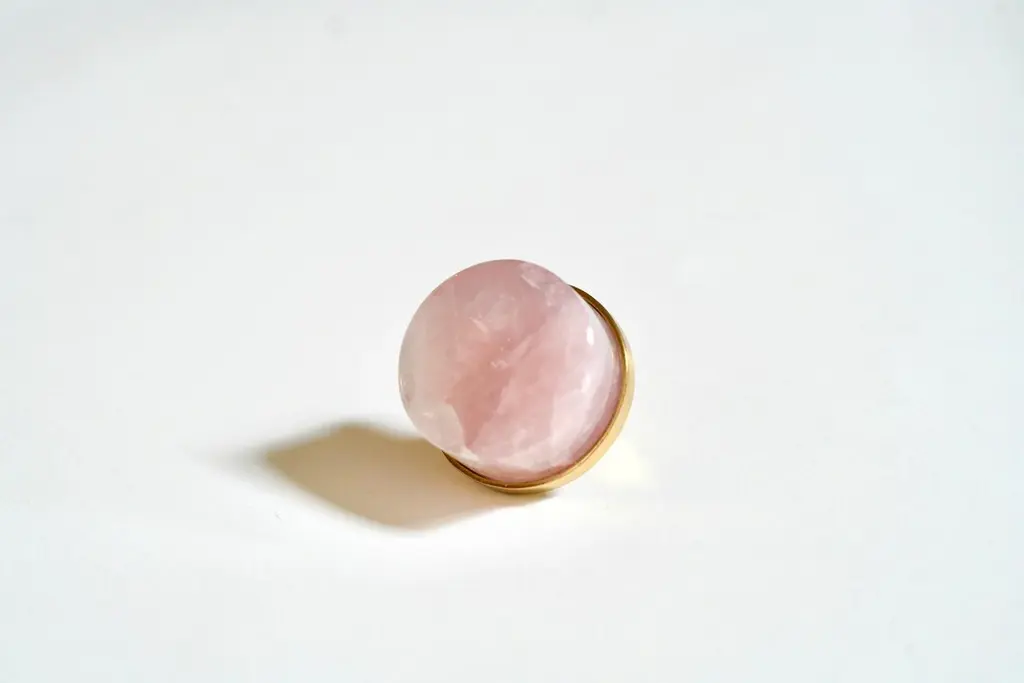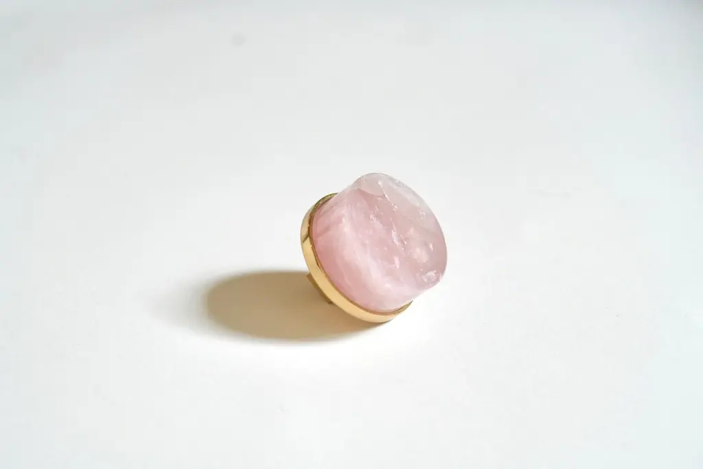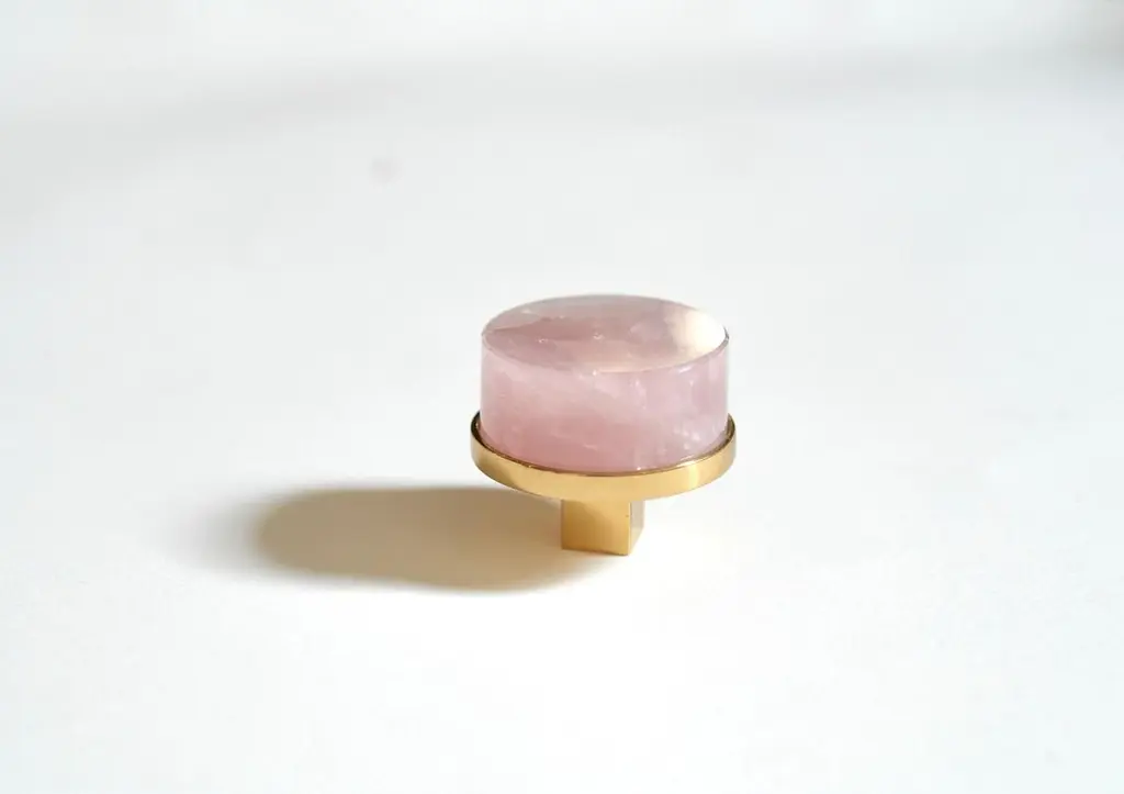 Circular form rose rock crystal quartz knob with polished brass base. Created by Phoenix Gallery, NYC.Custom size and finish upon request.