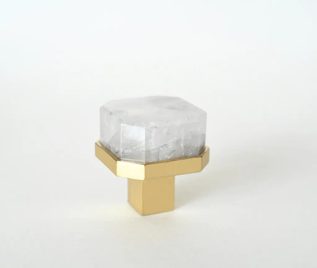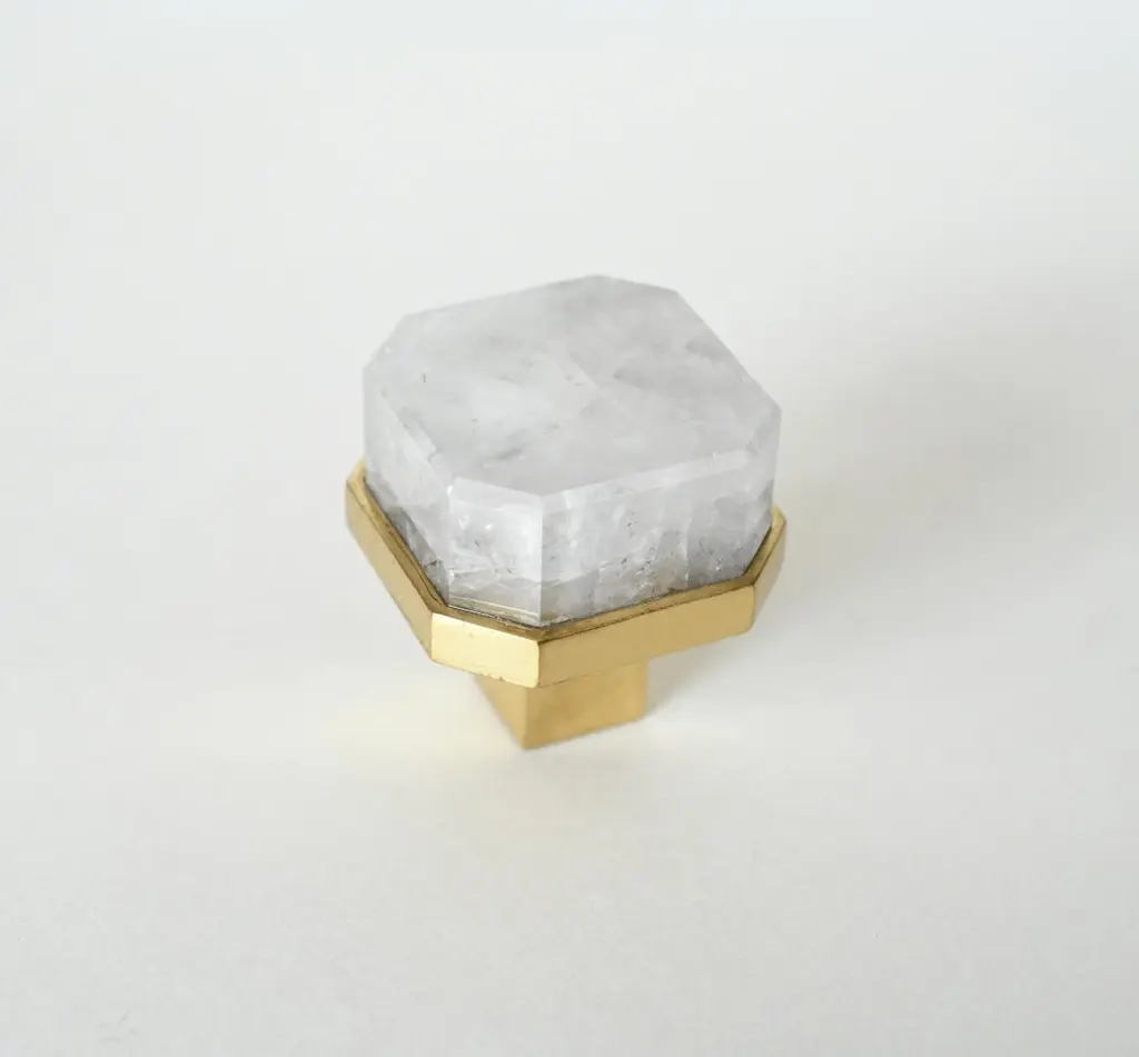Octagon form rock crystal quartz knob with polished brass base. Created by Phoenix Gallery, NYC.Custom size and finish upon request.
