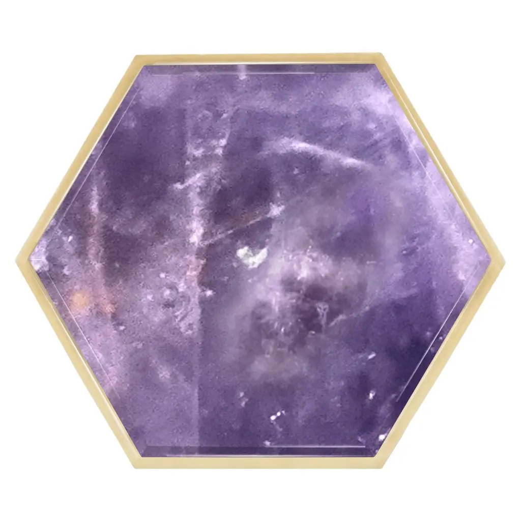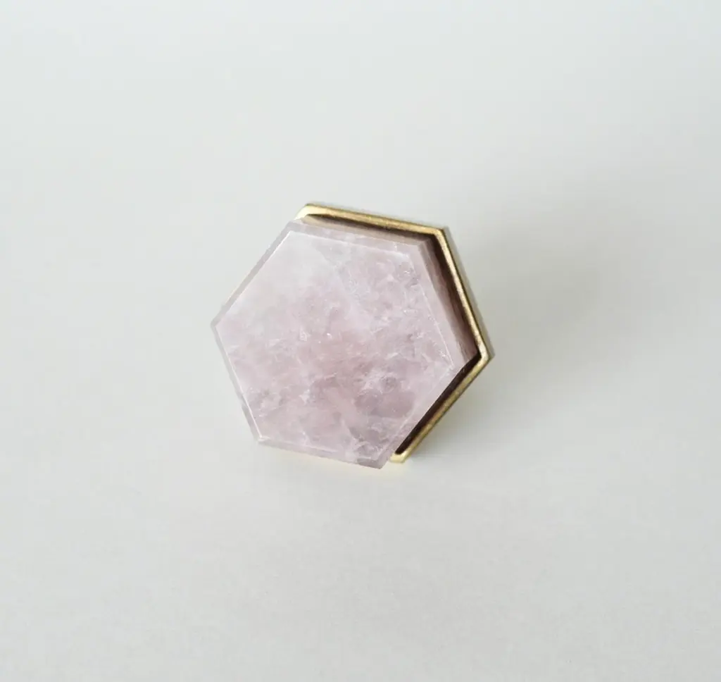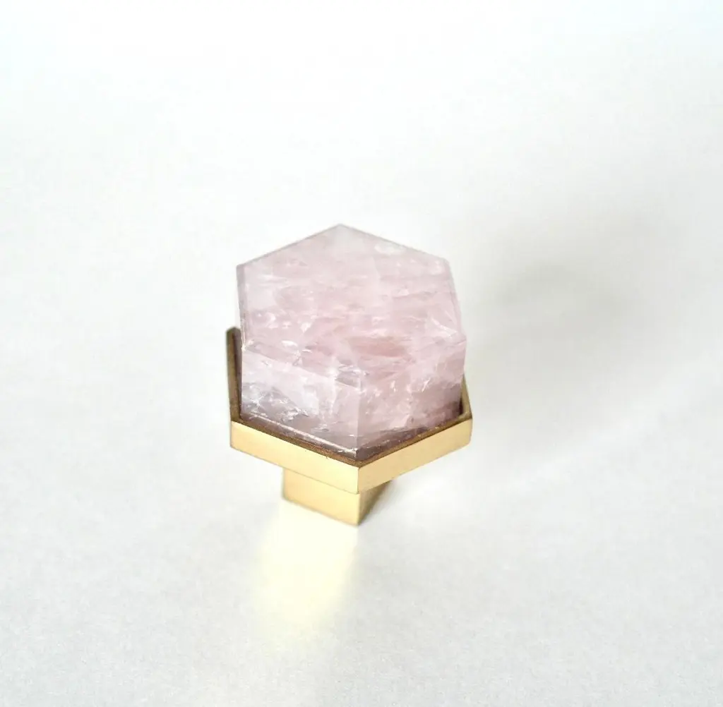 Hexagon form rose rock crystal quartz knob with polished brass base. Created by Phoenix Gallery, NYC.Custom size, and finish upon request.