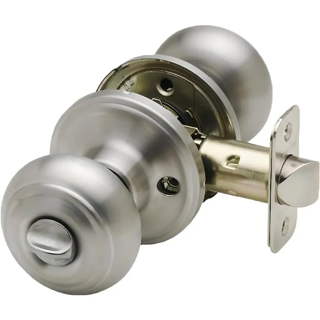 Upgrade your home with our elegant Satin Stainless Steel Door Knob, designed with a round colonial style and privacy locking function. Perfect for bedrooms and bathrooms, this door knob features a satin stainless finish, adjustable latches, and decorative rosettes. It is made with high-quality materials for enhanced security, durability, and ease of installation.Specifications:Color: Satin Stainless SteelDesign: Round Colonial KnobFunction: Privacy LockUse: Bedroom, Bathroom, Home ImprovementCompatibility: Fits All Standard DoorsFeatures: