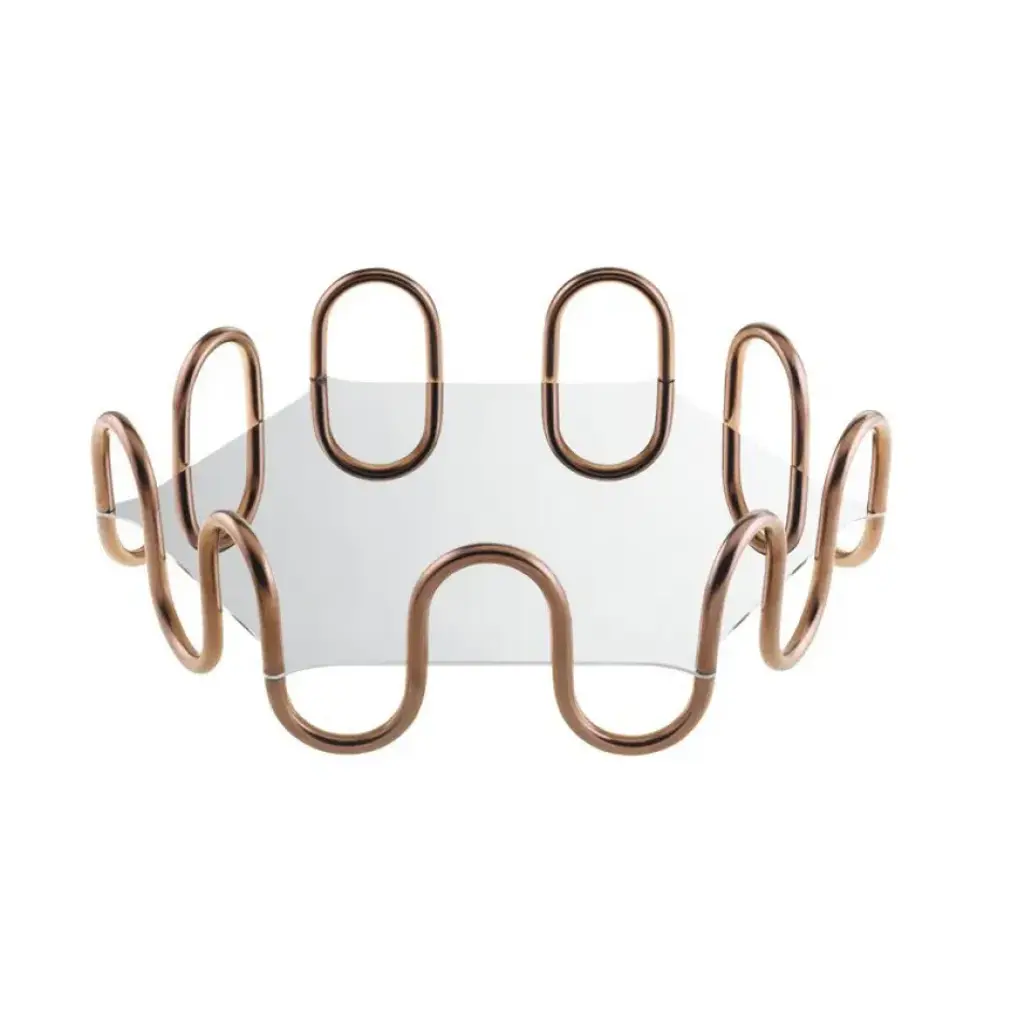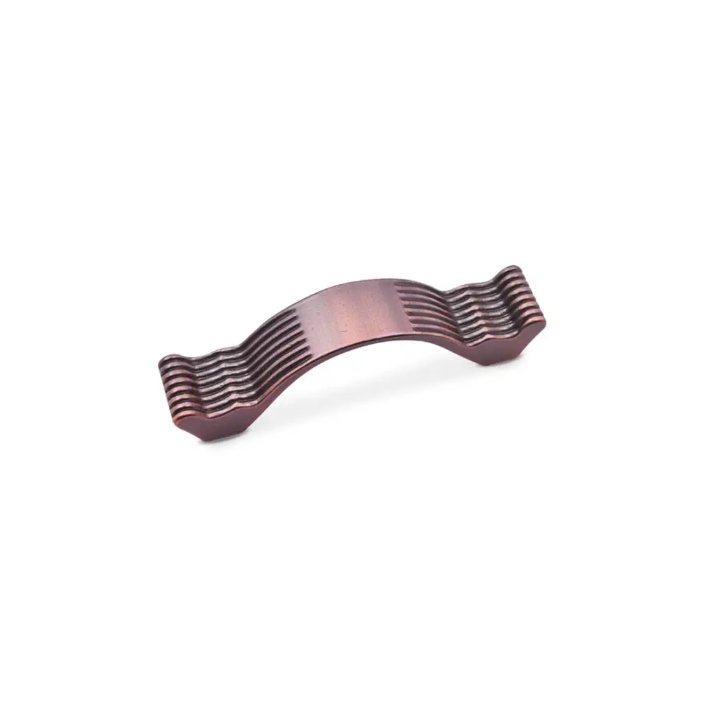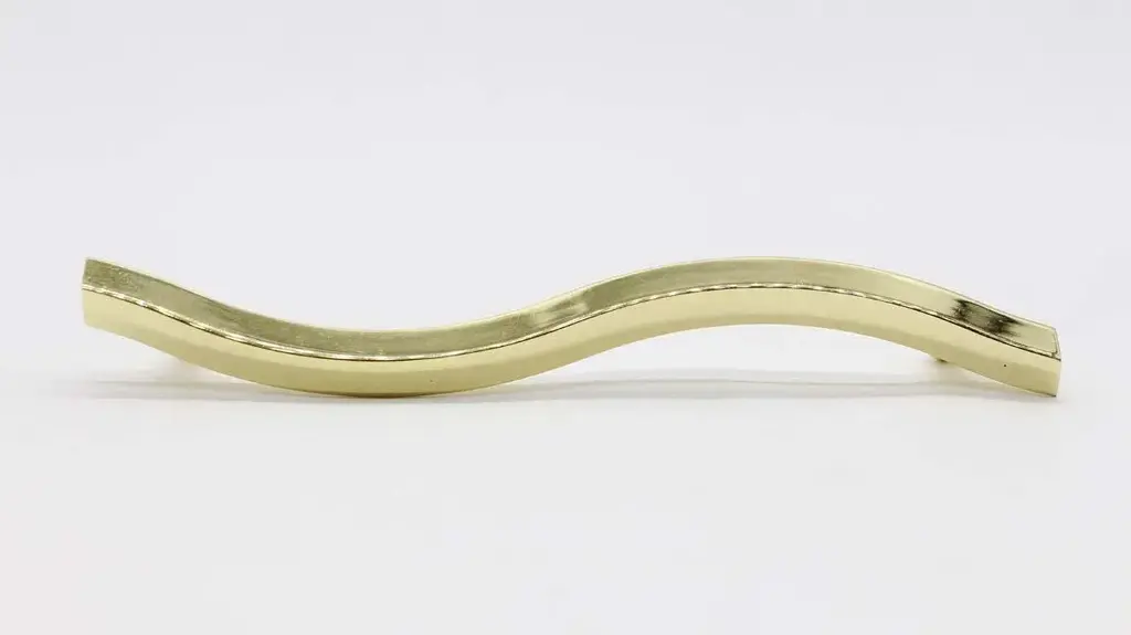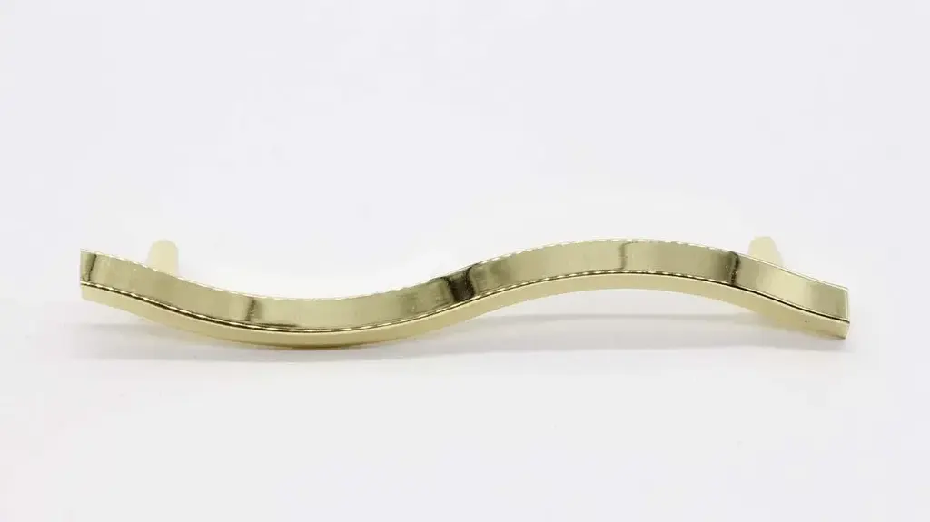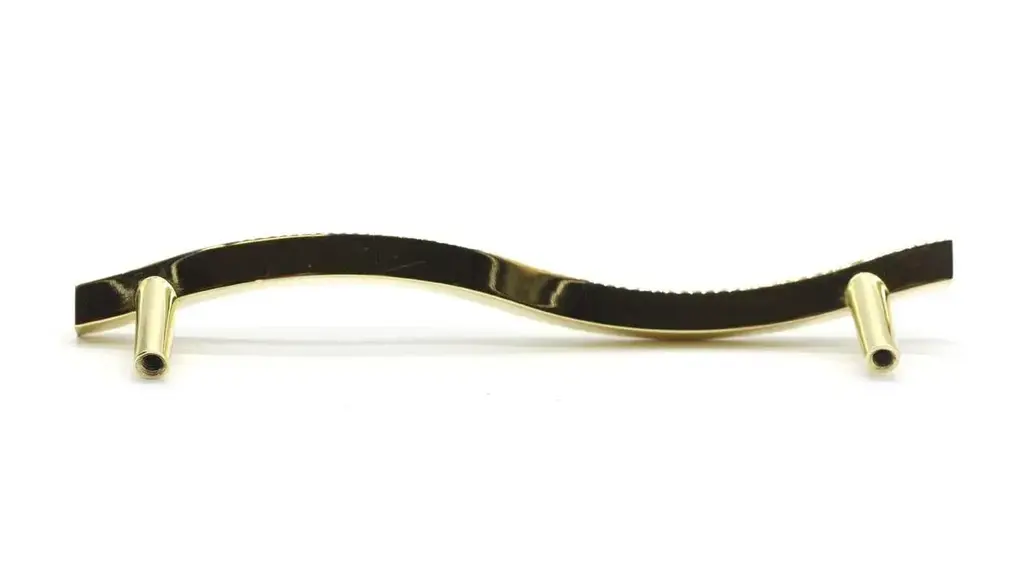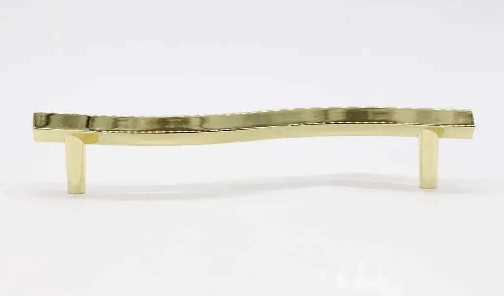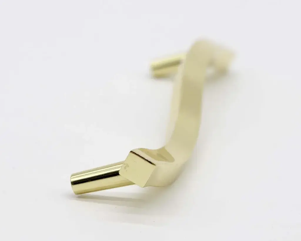 Olde new stock curved Modern style brass bridge drawer pulls with a polished surface. Made by Knob Hill. Priced per set of ten. The dimensions are 6.25 in. L x 1.25 in. D x 1 in. W, center to center 5.125 in..