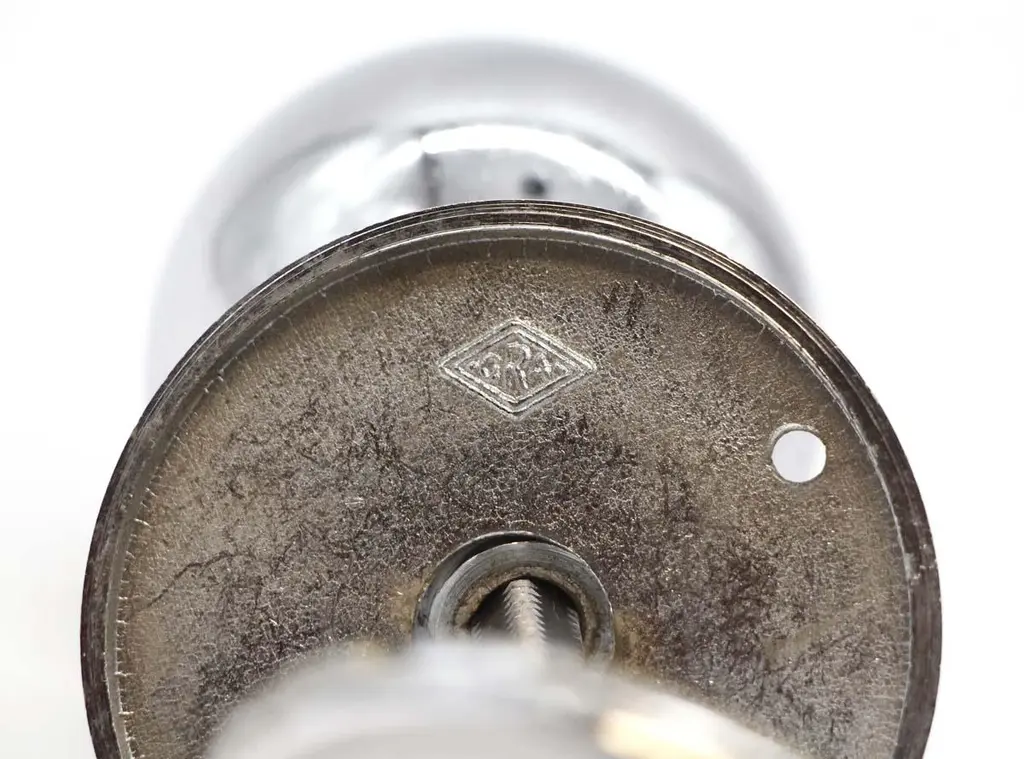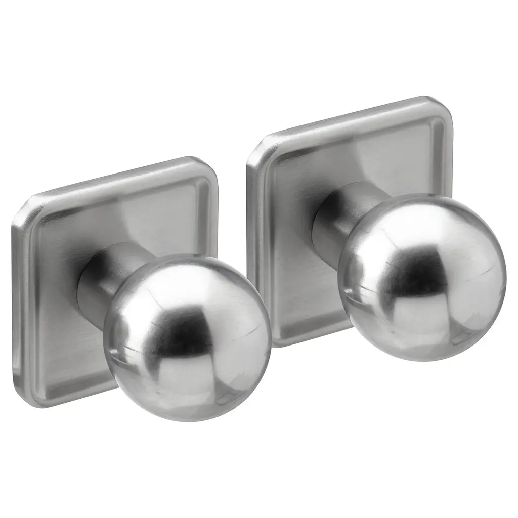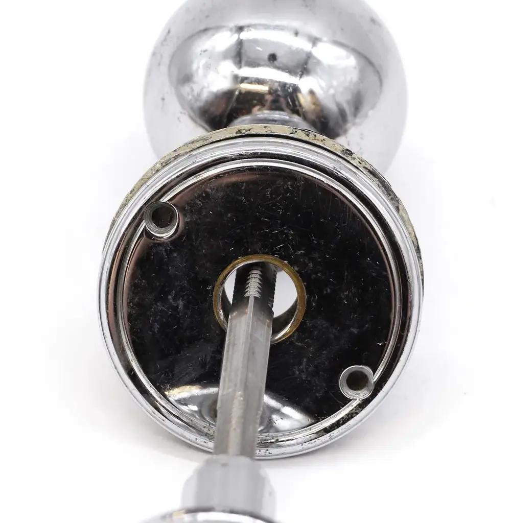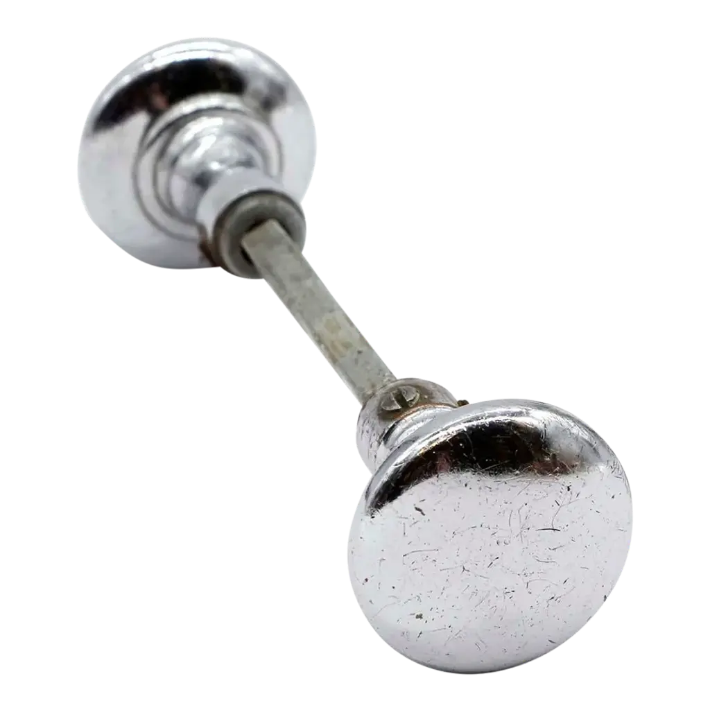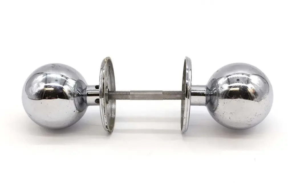 This set of chrome ball shaped door knobs offers contemporary allure. With a sleek design, they provide a stylish and functional upgrade for doors with modern sophistication for a whole floor of your home or an apartment. They are in great used condition with surface wear. The manufacturer and exact date of creation are unknown. The dimensions are Knob 3 in. D x 2.5 in. diameter, rosette 2.5 in. diameter x 0.25 in. D.