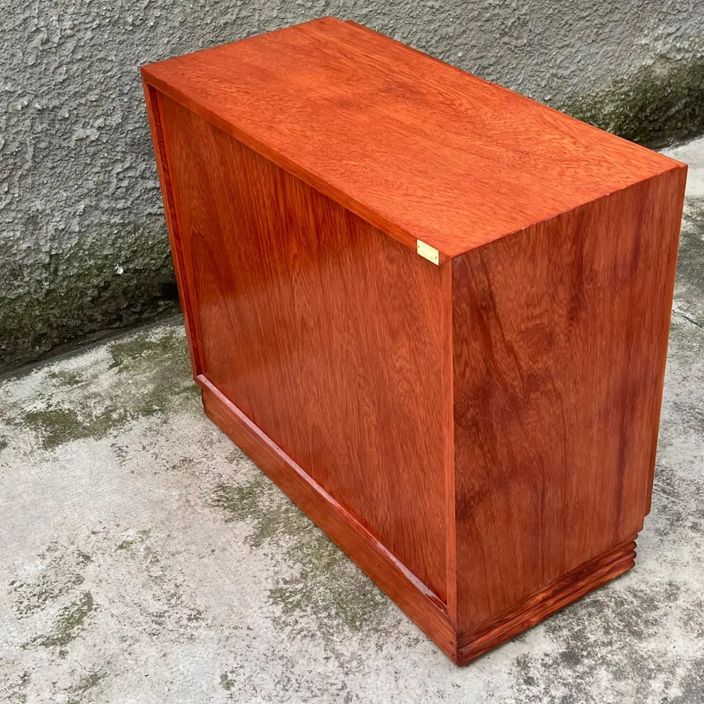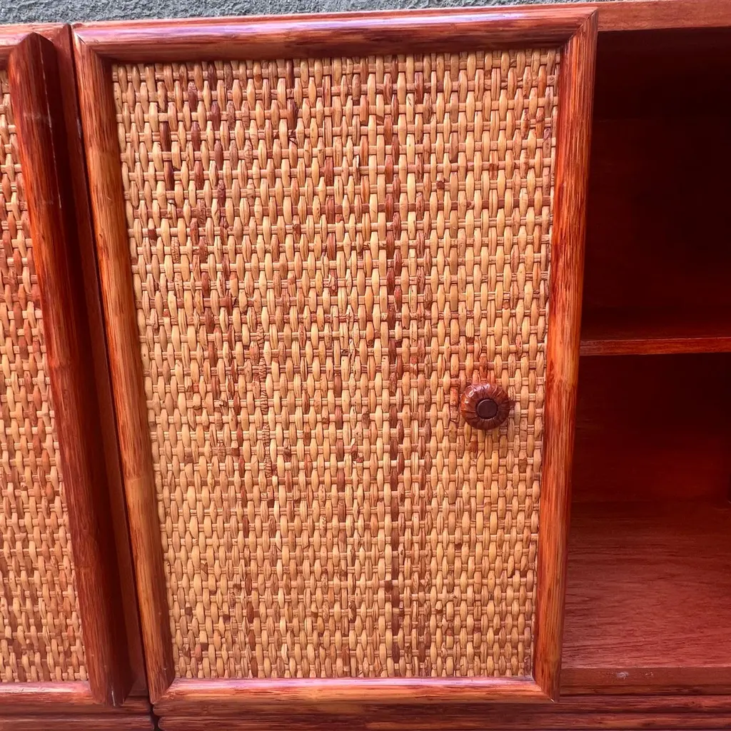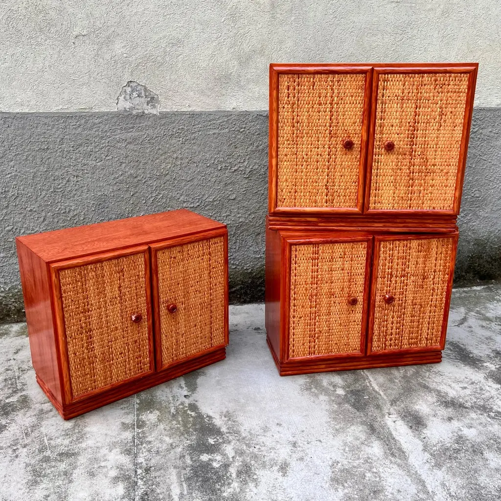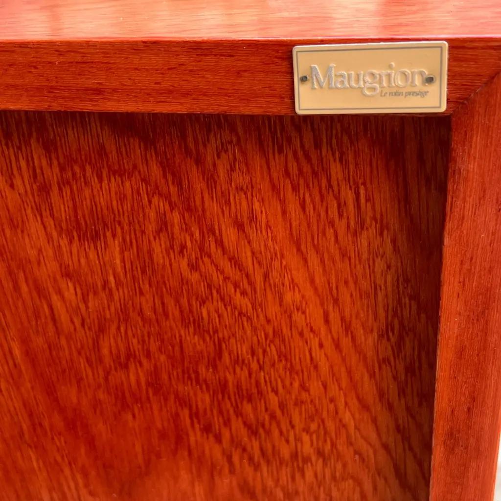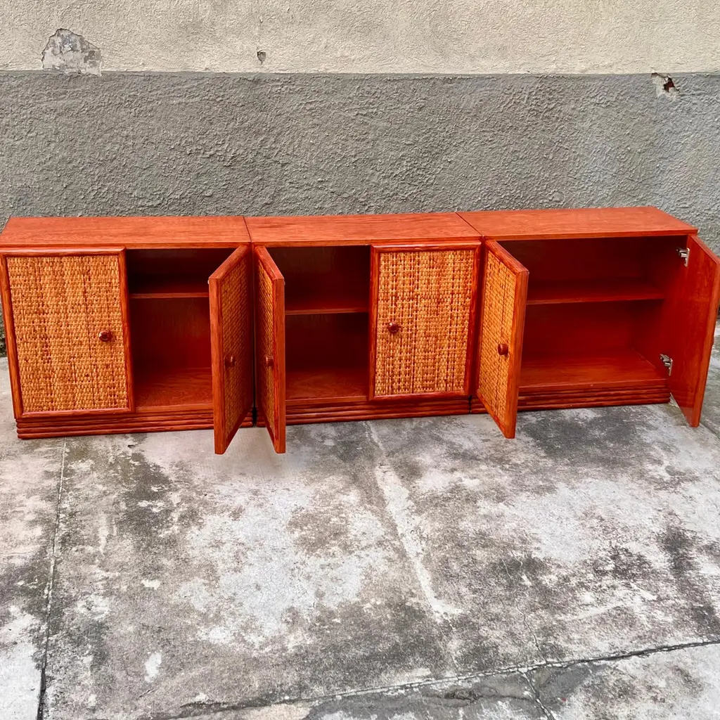 Elegant storage cabinet from the 1980s, the result of a collaboration between the renowned French companies Maugrion and Roche Bobois. This one-of-a-kind piece, made of fine mahogany wood, is distinguished by woven wicker front doors that lend a touch of authenticity and naturalness. The leather-covered door knobs add an additional element of sophistication, making this piece of furniture not only functional but also a true design element.Three examples of this piece of furniture are available, which can be purchased individually or as a block, offering the possibility of composing a modular sideboard. Each piece maintains its own unique identity while harmoniously integrating with the others.Maugrion: Known for its craftsmanship and use of fine materials, Maugrion has helped define the elegant and timeless style of French furniture, combining tradition and innovation.Roche Bobois: A world leader in high-end furniture, Roche Bobois is synonymous with excellence in contemporary design. The company collaborates with internationally renowned designers and craftsmen, offering exclusive collections that stand out for their originality and quality.This piece of furniture is perfect for those looking for a piece of furniture that combines traditional craftsmanship with sophisticated design, suitable for any elegant and sophisticated setting.