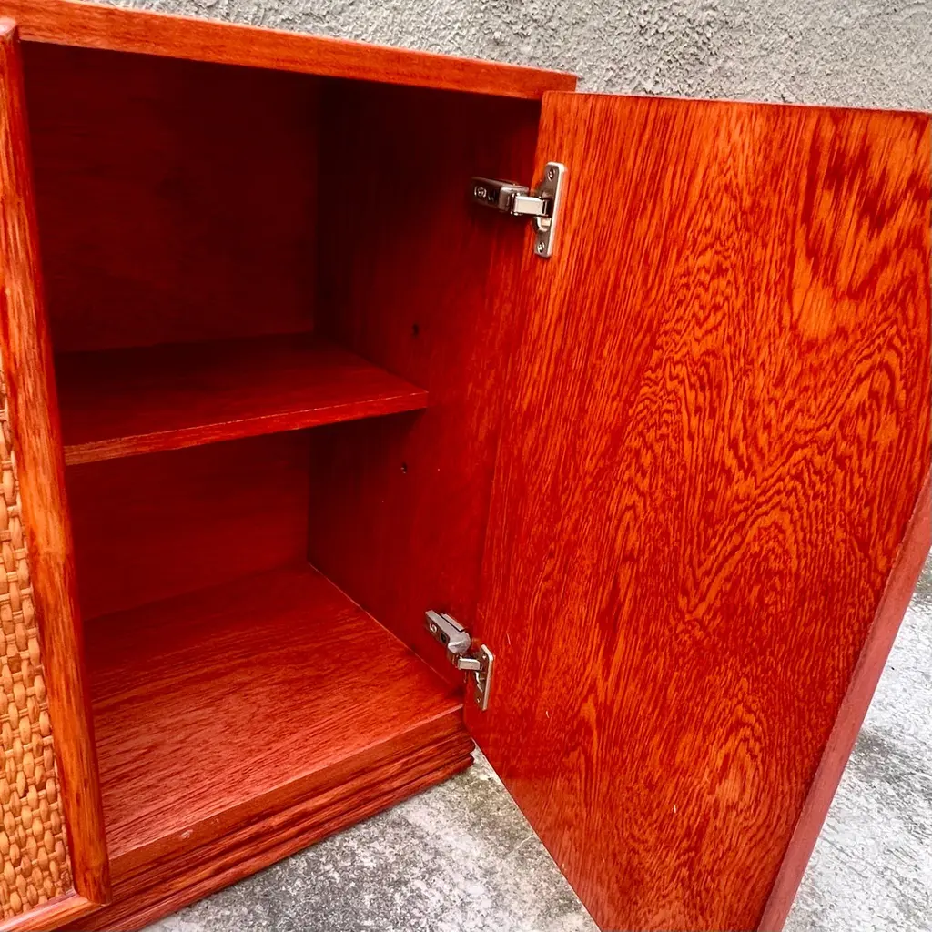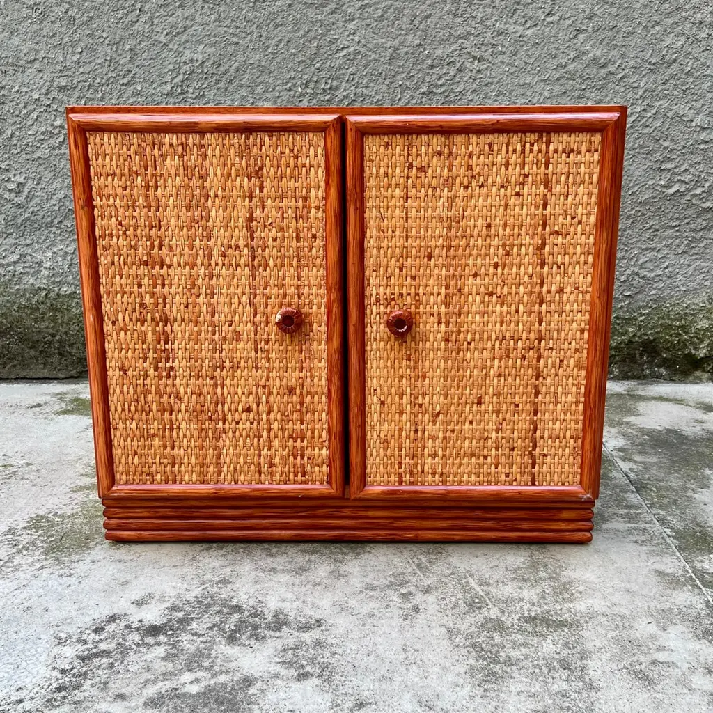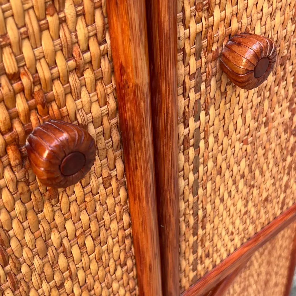 Small Wood And Rattan Cabinet - Leather Knobs - Maugrion/roche Bobois - 80's