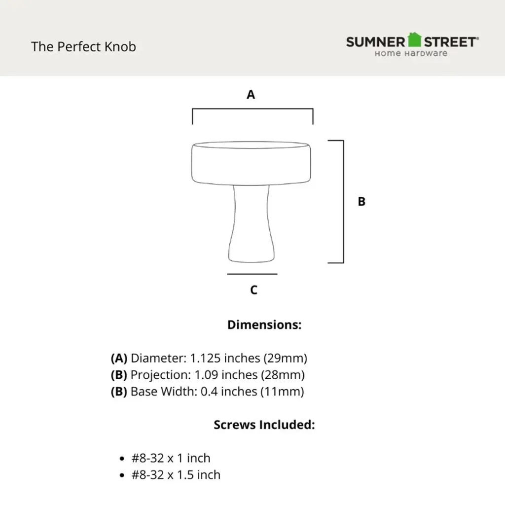 The Perfect Knob perfectly complements modern, traditional, transitional, and casual kitchens and baths. The Perfect Knob is crafted from durable die-cast zinc with a durable finish to ensure lasting quality. This knob is the ideal choice for contractors seeking reliable solutions and DIYers craving hassle-free upgrades. Add the Perfect Knob to any Sumner Street Home Hardware collection, and be assured the finish you choose will match throughout our collections. Elevate your cabinetry effortlessly with this practical yet stylish knob, designed to meet the needs of professionals and home renovators alike.