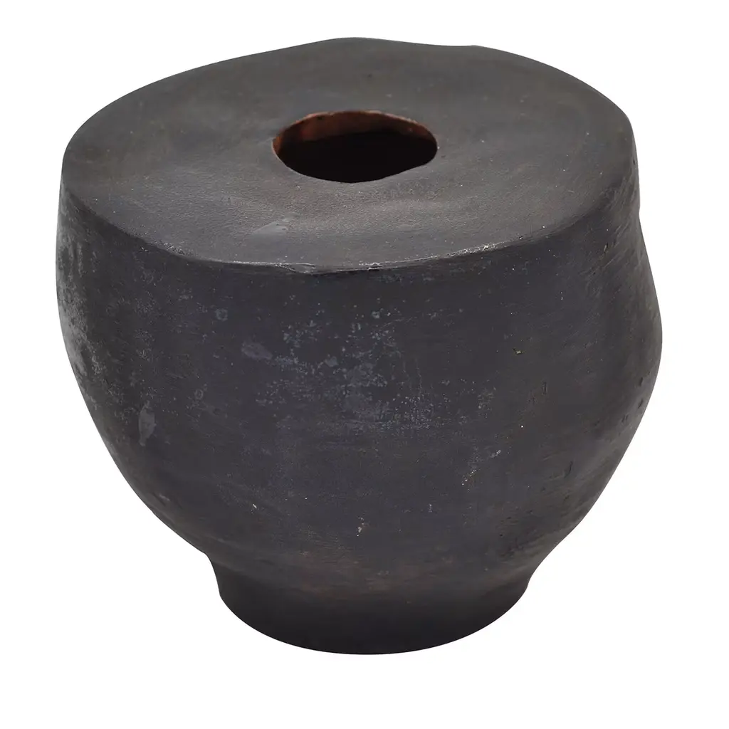Vintage cabinet drawer knob with a concentric design. It is made of brass with a dark finish. A mounting screw is included. Good condition with surface wear from prior use. Priced each. The manufacturer and exact date of creation are unknown. The dimensions are 1.375 in. diameter x 1.375 in. D.