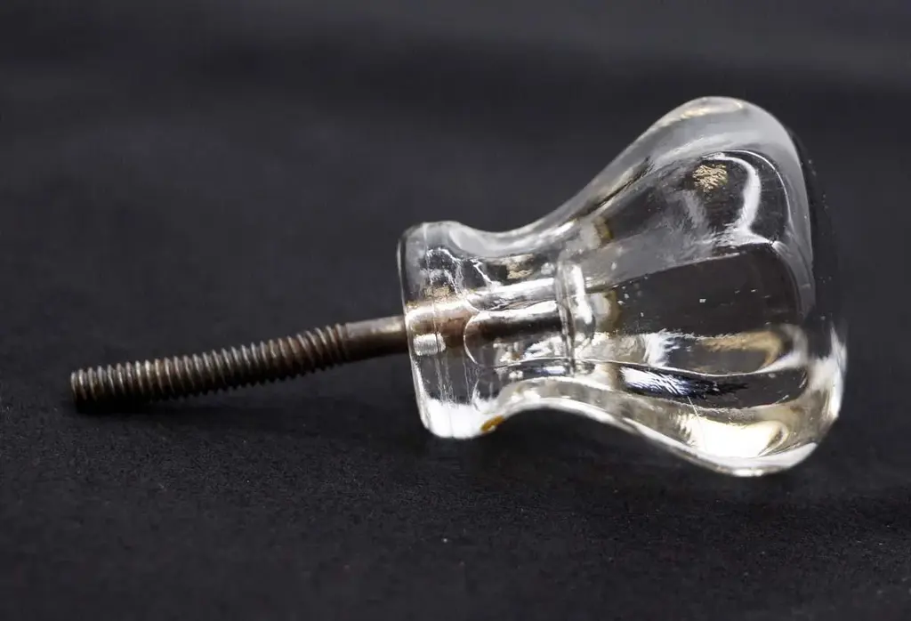 Vintage scalloped shaped clear glass cabinet or drawer knob. A screw is included. Good condition with appropriate wear from age. Priced each. The manufacturer and exact date of creation are unknown. The dimensions are 1.375 in. diameter x 1.625 in. D.