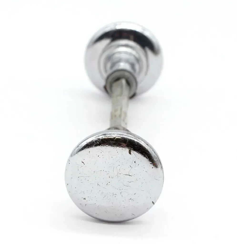 Vintage plain chrome plated brass round doorknobs. The manufacturer is unknown. Priced per pair of knobs with spindle. The manufacturer and exact date of creation are unknown. The dimensions are 2 in. D x 1.75 in. diameter.