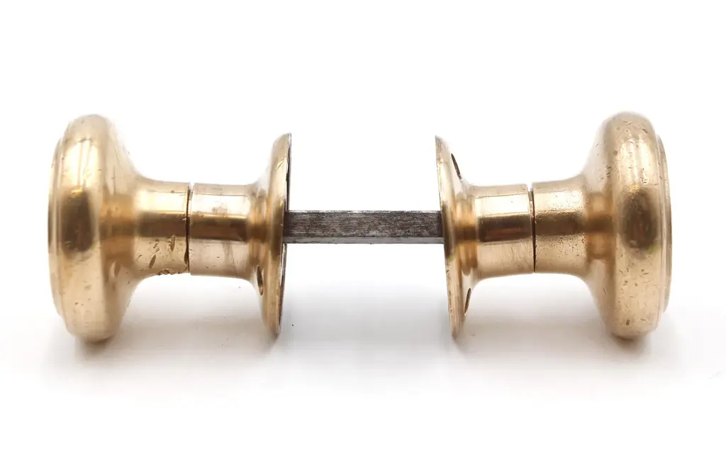 Vintage round concentric door knobs with matching rosettes. Good condition with appropriate wear from age. Priced as two door knobs, two rosettes, and a spindle. Priced each. The manufacturer and exact date of creation are unknown. The dimensions are Knob 2.25 in. diameter x 1.75 in. D, rosette 2 in. diameter x 1 in. D.