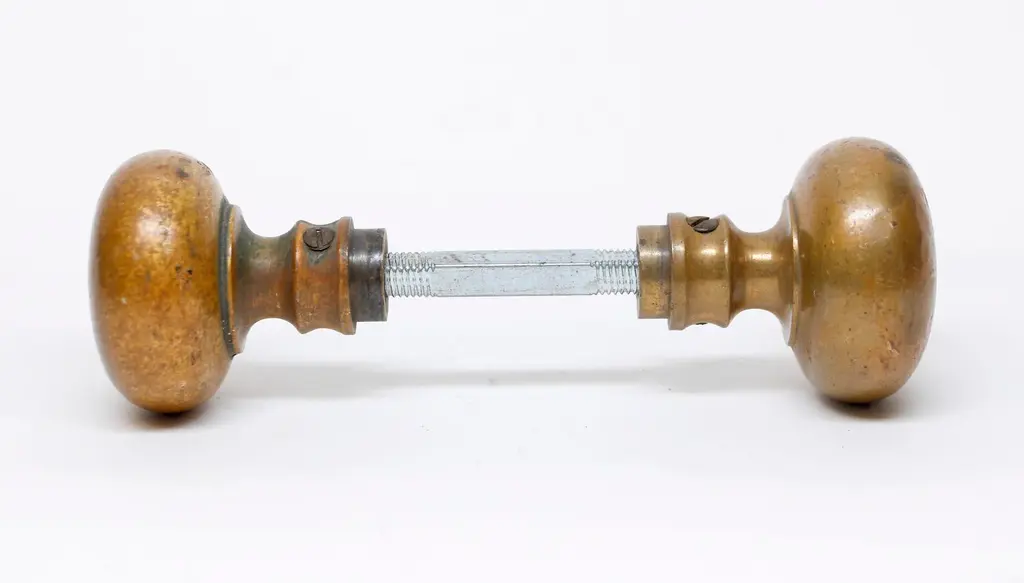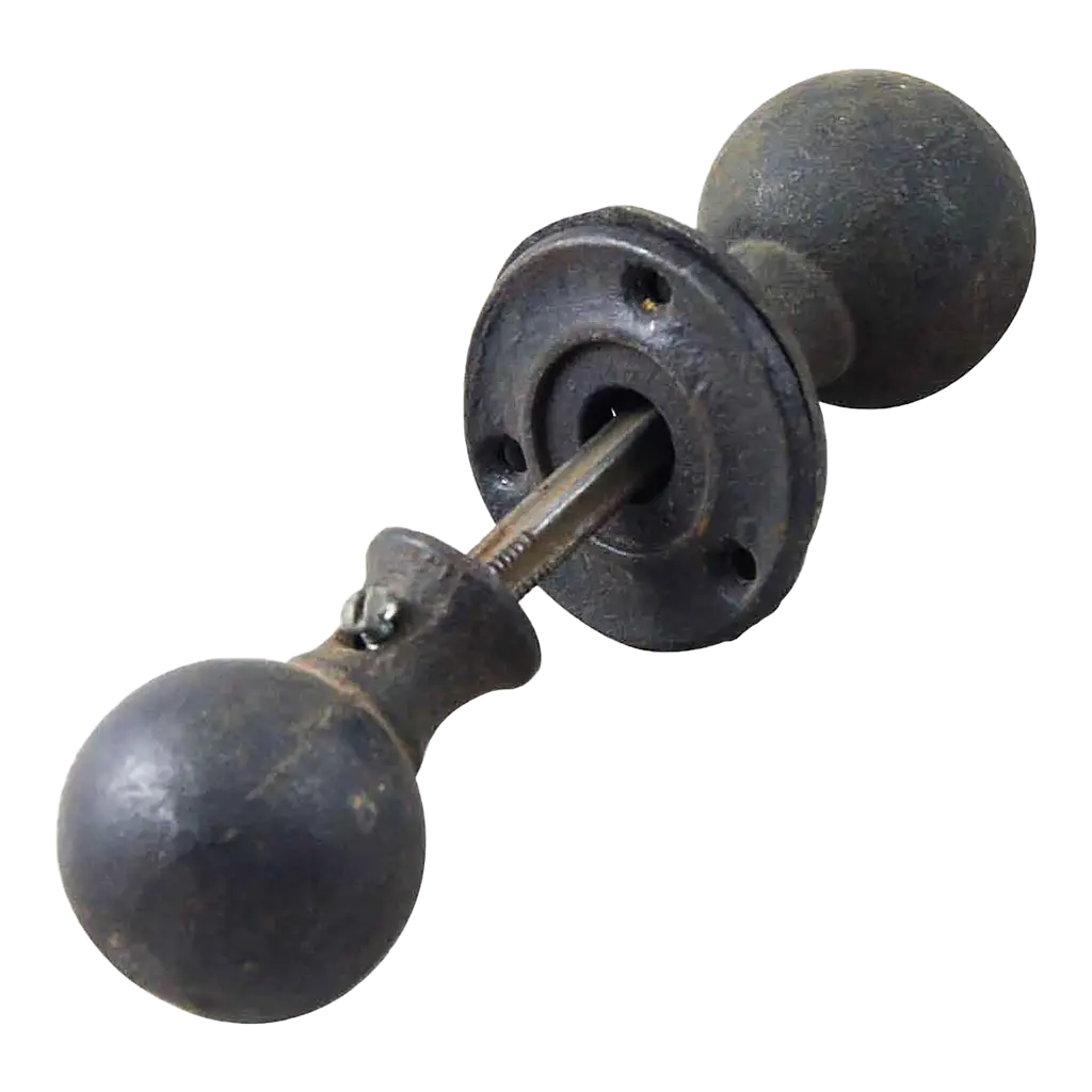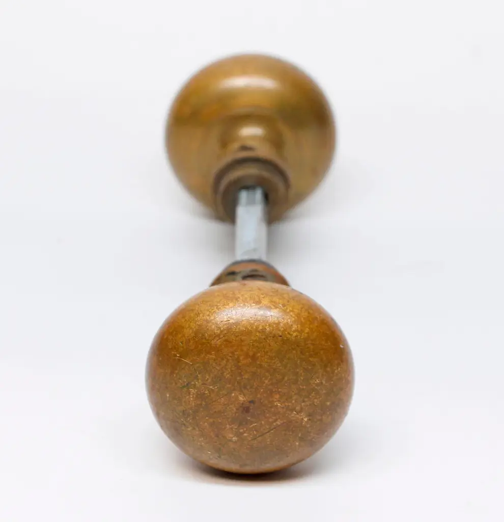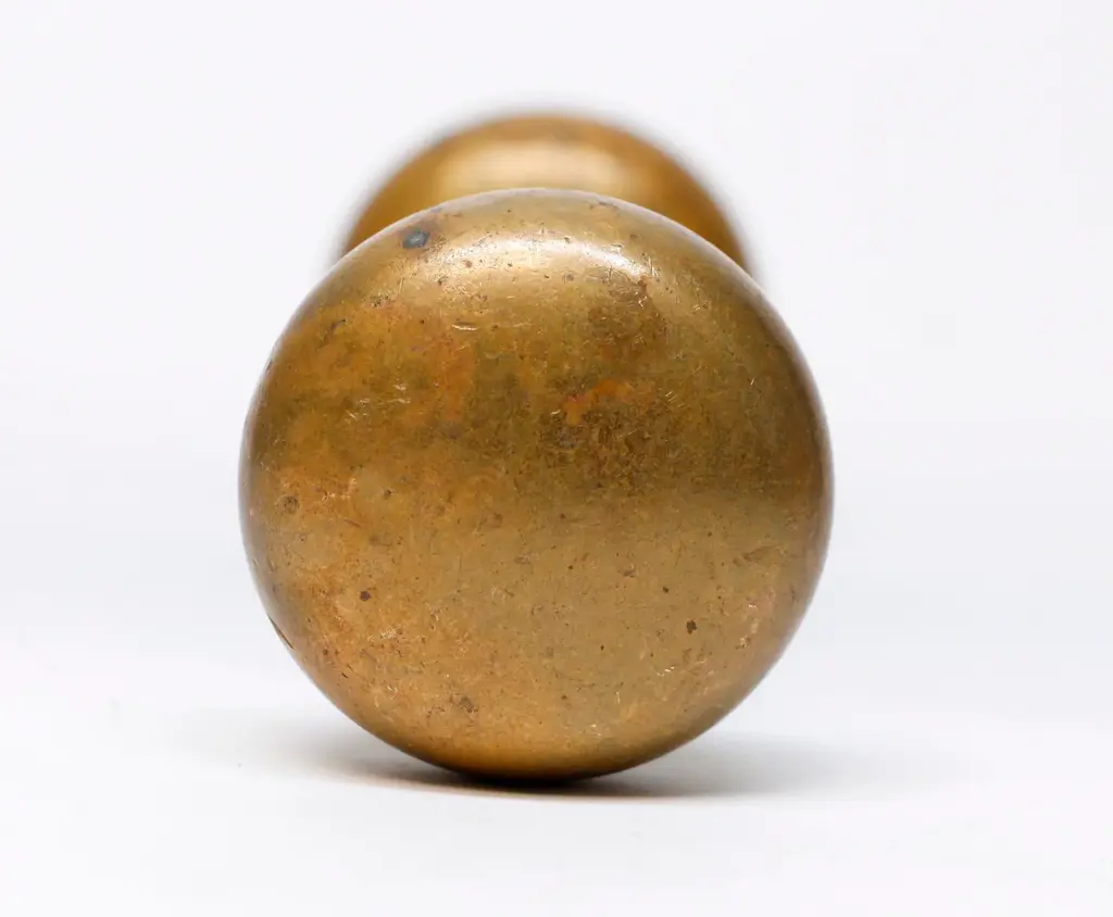 Plain bronze door knobs with a great antique patina. The manufacturer is unknown. These can be polished to a high sheen if you wish, or we can leave them with their original patina. Priced per pair of knobs with spindle. Good condition with surface wear from prior use. The manufacturer and exact date of creation are unknown. The dimensions are 2 in. diameter x 2.25 in. D.