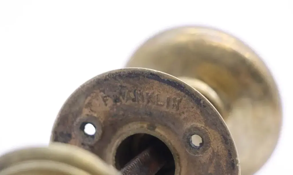 Vintage passage door knob set with two matching rosettes in patina brass construction. Good condition with appropriate wear from age. Rosettes stamped Franklin. Priced as two door knobs, two rosettes, and a spindle. Priced per set. Patinas may vary. The manufacturer and exact date of creation are unknown. The dimensions are Knob 2.25 in. diameter x 2 in. D, rosette 2.25 in. diameter x 1 in. D.