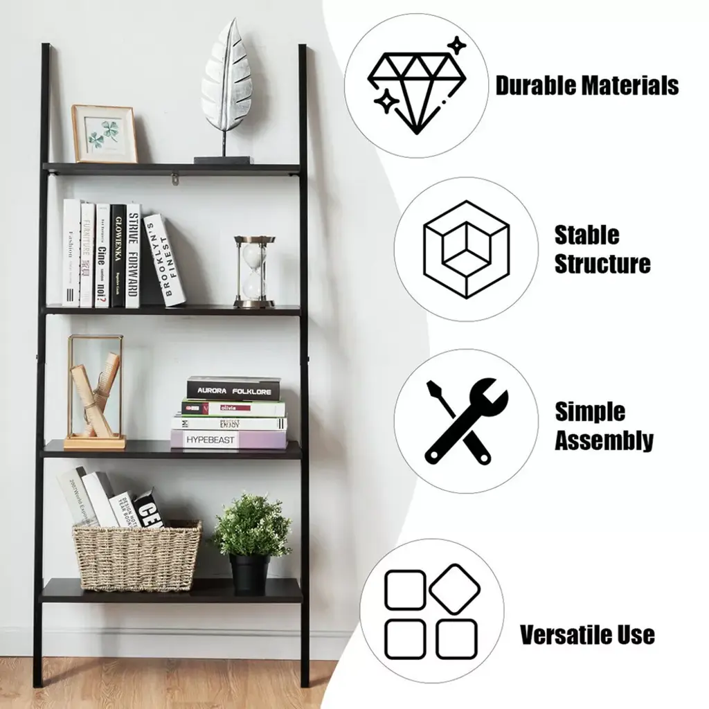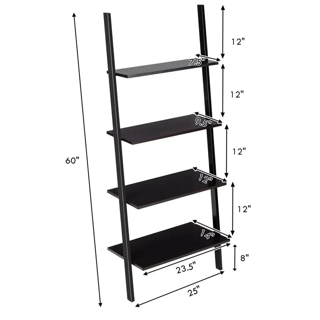 Are you still searching of a home organizer with a large storage capacity but a small footprint? Our 4-tier ladder shelf will be your ideal choice! Made of high quality particleboard, each shelf can support items strongly without worrying about easy bending and breaking. The powder-coated metal frame is sturdy and not easy to rust, providing a longer service life. While the ladder shelf shows a leaning appearance, actually all shelf layers lean against the wall at a 90° angle in order to reach maximum stability. Featuring four open shelves, this storage rack is convenient for storing books, potted plants, photo albums or kitchen supplies in an orderly manner. Order now to add a touch of rustic and vintage flavor into your home! Features Material: Particle Board + Iron Color: Black/Brown Overall Dimension: 25'' x 14'' x 60'' (L x W x H) Net weight: 20 lbs Weight Capacity of Each Shelf: 22 lbs Package includes: 1 x 4-Tier Ladder Shelf 1 x Instruction
