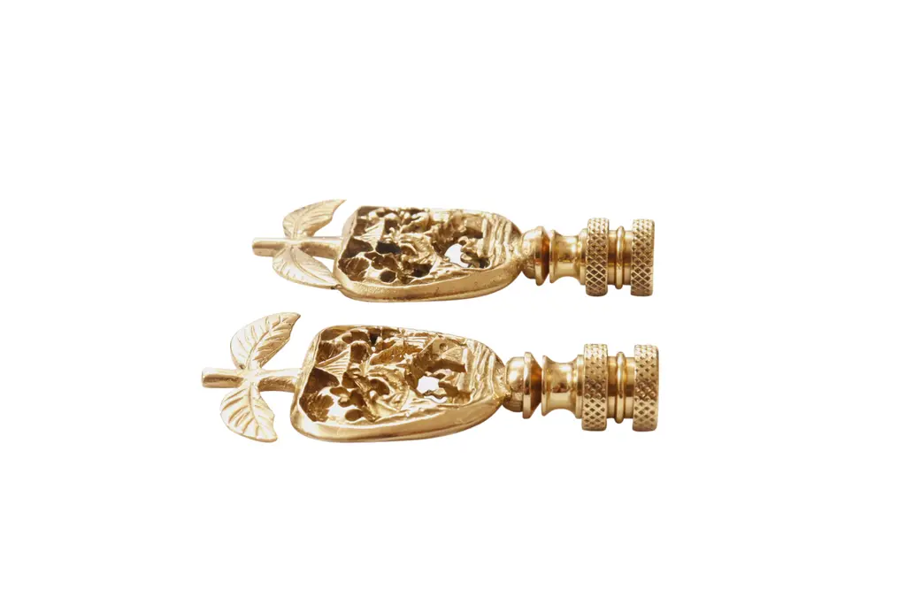 A pair of Chinoiserie pierced brass apple lamp finials. Fits a standard size lamp harp. Dimensions per finial.