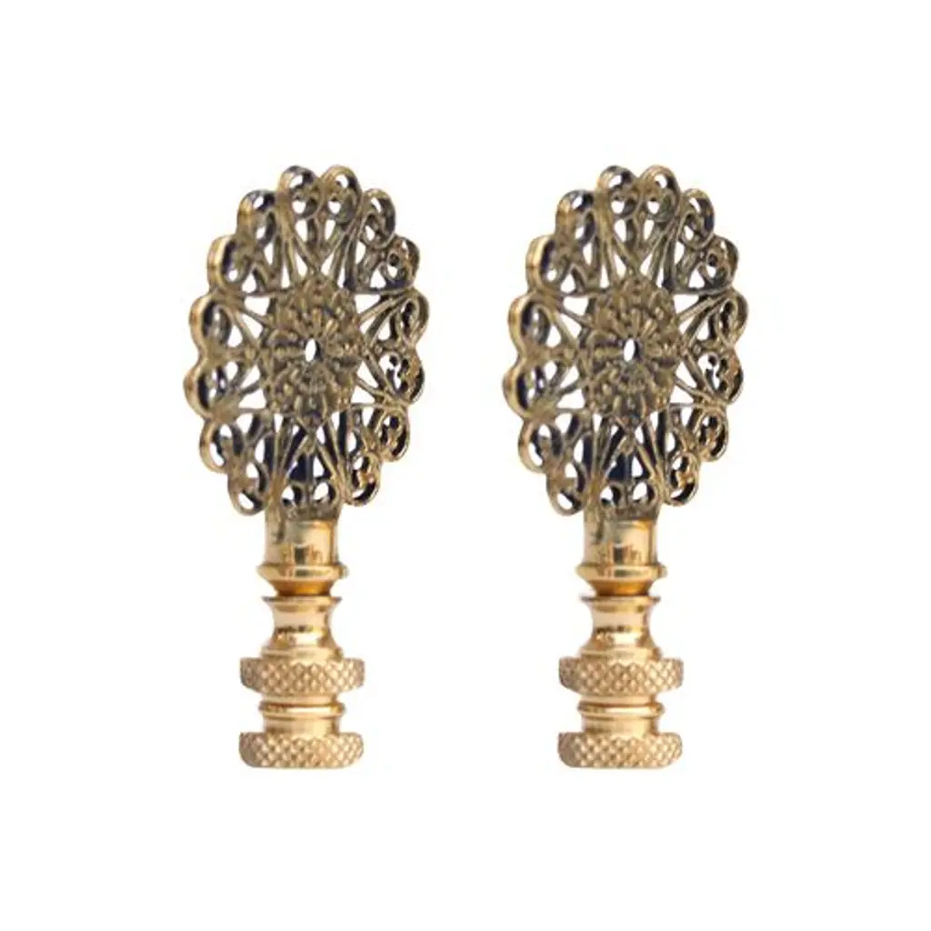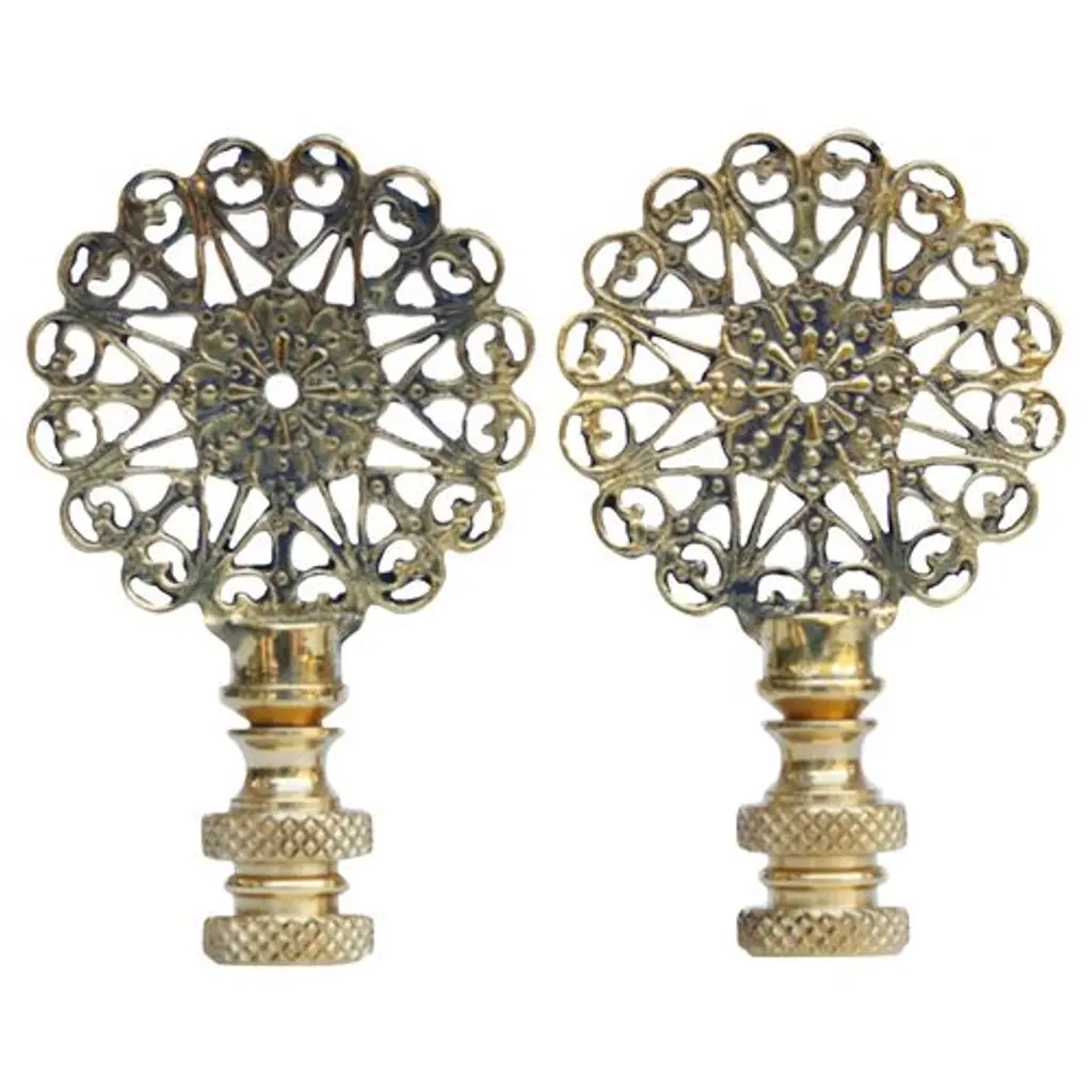 A pair of lacy brass lamp finials. Fits a standard size lamp harp. Dimensions per finial.