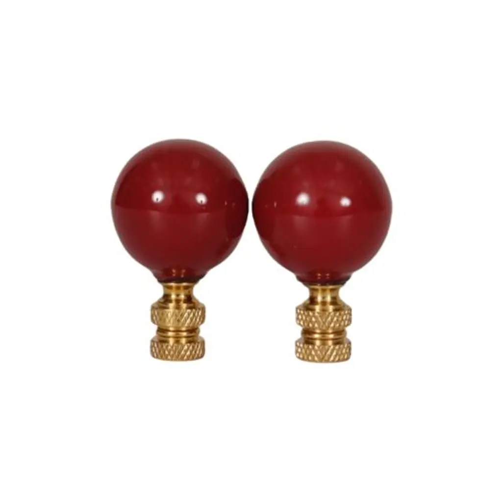 A pair of red porcelain ball lamp finials. Fits a standard size lamp harp. Dimensions per finial.