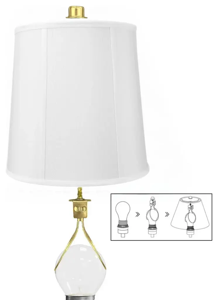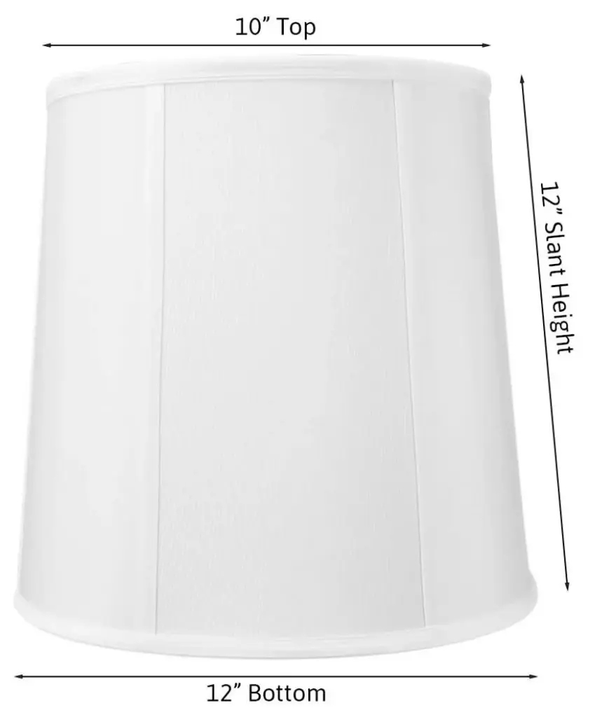 CLIP-ON Fitter lampshade is designed to clip on to your standard edison light bulb. Standard light bulbs are 1.75" wide. Home Concept Signature Shades feature the finest premium thick White Linen Shantung Fabric in Drum Lampshade.Durable parchment means your new lampshade will last for decades. It wont get brittle from smoke or sunlight like less expensive paper shades.Heavy brass and steel frames means your shades can withstand abuse from kids and pets. It''s a difference you can feel when you lift it. Illuminate your living space with the refined touch of our Clip on Fitter Lampshade, blending functionality with style.CLIP ON Fitter designed to clip on to your standard edison light bulb. Standard light bulbs are 1.75" wide. PLEASE REVIEW ALL IMAGES TO VERIFY THIS SHADE WILL FIT ON YOUR LAMP BASE. Illuminate your living space with the refined touch of our Clip on Fitter Lampshade, blending functionality with style.FABRIC - White Linen Drum LampshadeDIMENSIONS - 10" Top x 12" Bottom x 12" Slant heightDELUXE LAMP SHADE, found in better lighting showrooms. Durable Hotel quality shade.COMPLETE SHADE KIT Includes everything you need to use on bare-bulb lamp: Clip-on fitter, lampshade, and brass finial Cap.