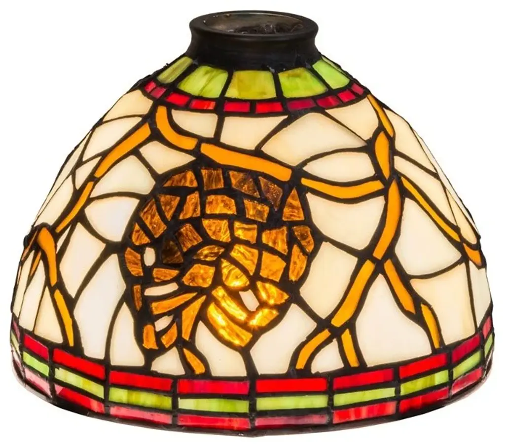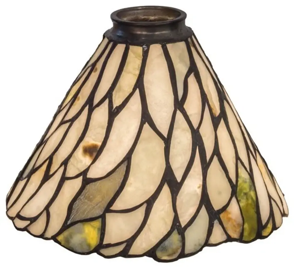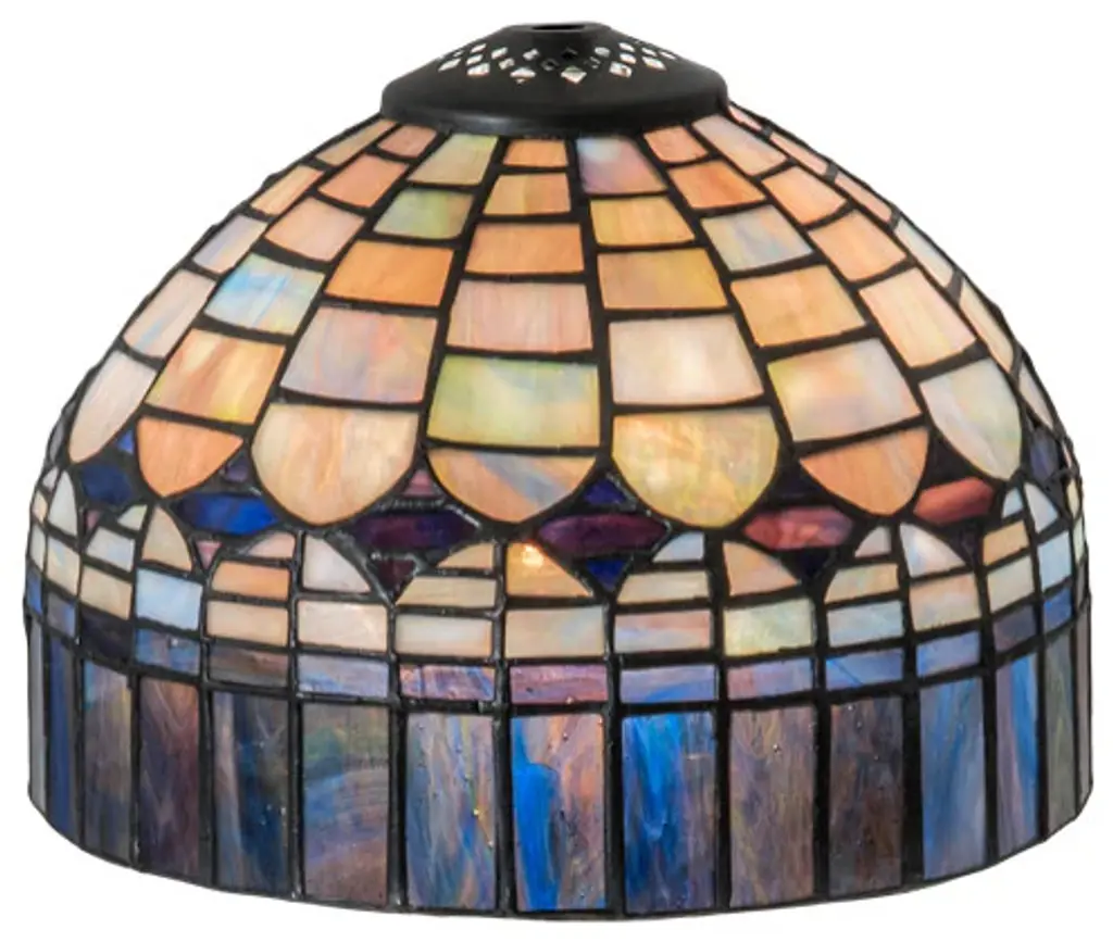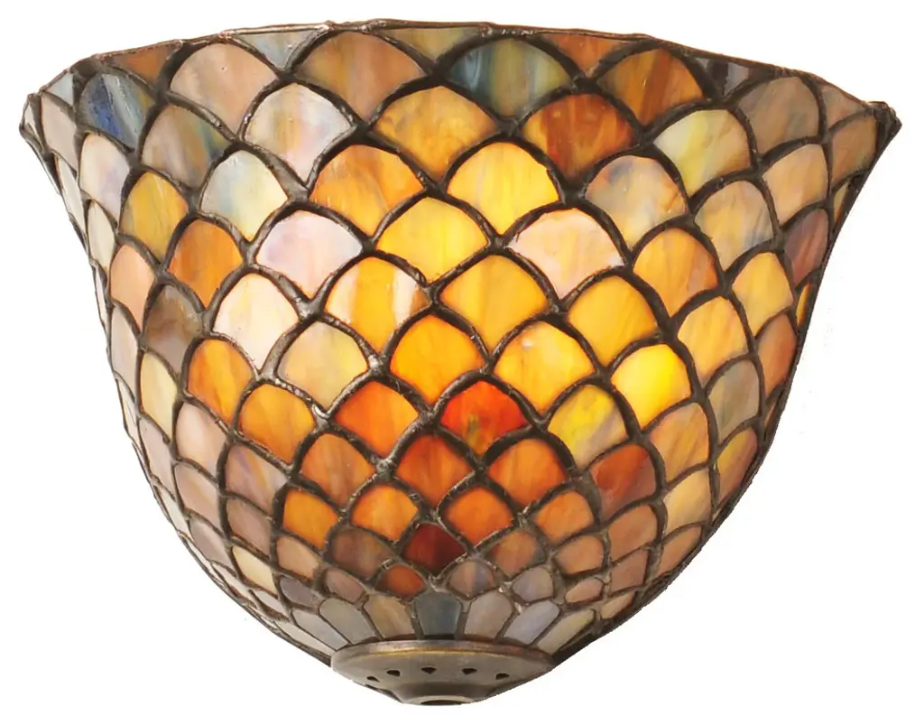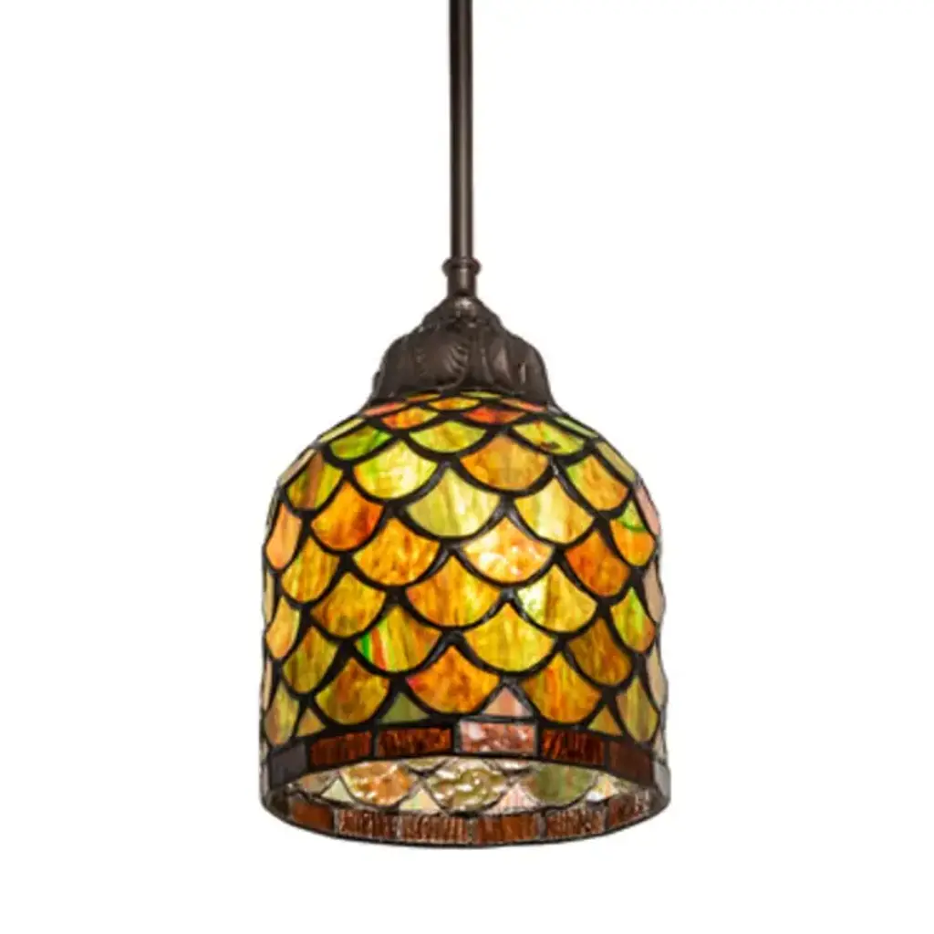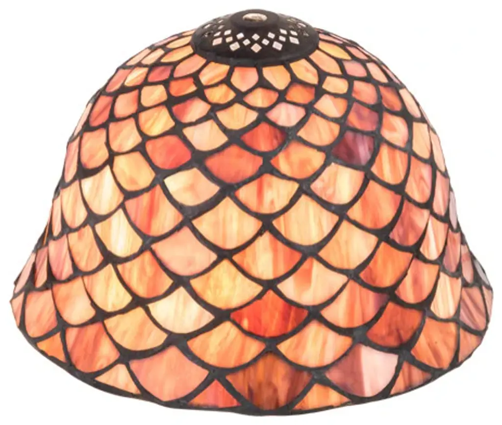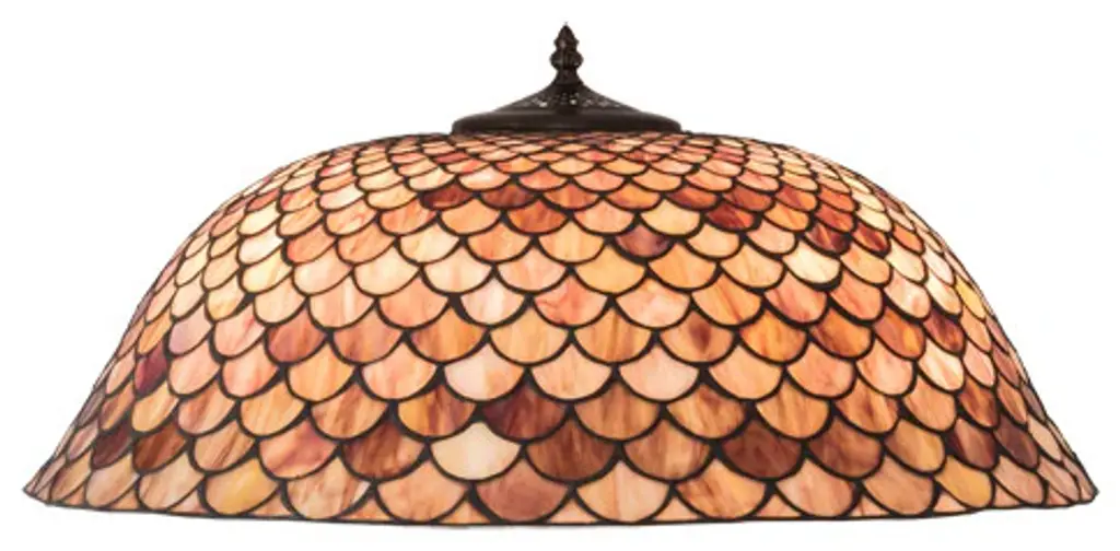A Louis Comfort Tiffany studio classic... The renowned Fishscale design features a variegated Tortoiseshell of Emerald; Sapphire; Mauve; and Beige colored art glass; evoking a unique dimensional and textured look in a rainbow of brilliant hues. This exquisite art glass shade is created using the famous Meyda Tiffany copperfoil construction process and enhanced with a Mahogany Bronze finish. Inspired by Rainbow Trout and other colorful fish found in Northwest Montana; Eastern Idaho; and Baja; California. The shade can be paired with a base to create a table lamp or matched with hardware to build a ceiling fixture. The Tiffany Fishscale Shade is included in our American-designed Tiffany Reproduction Lighting Collection. Each shade is a unique work of art with color variations based on natural ingredients inherent in the glass.