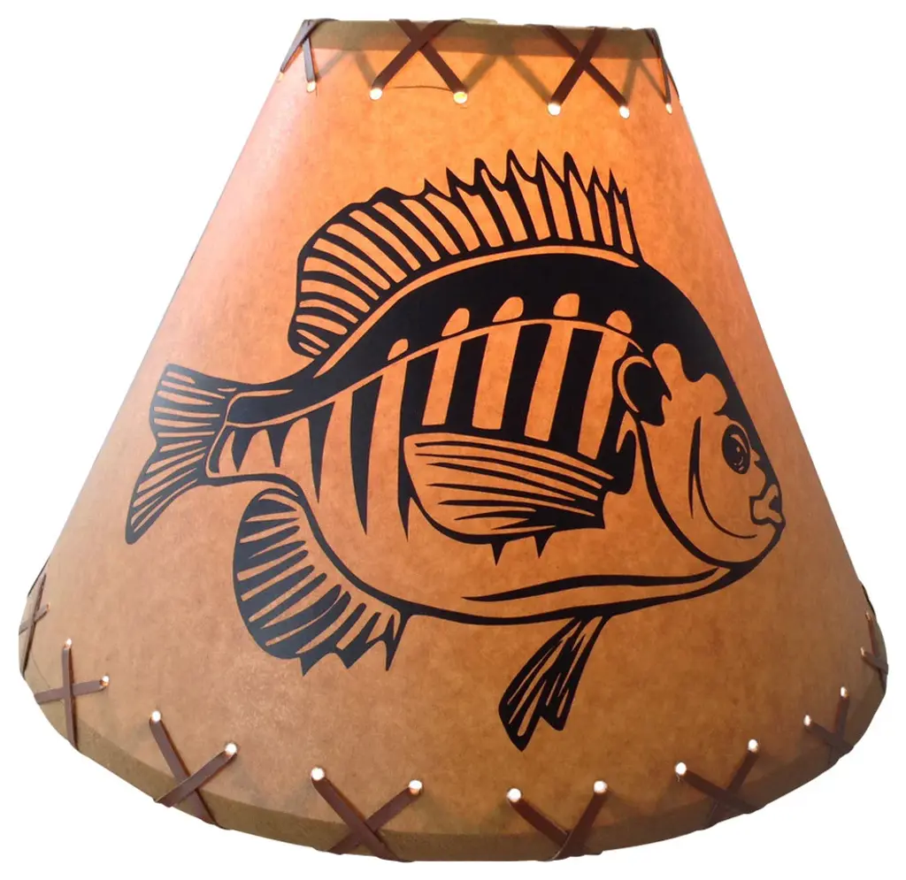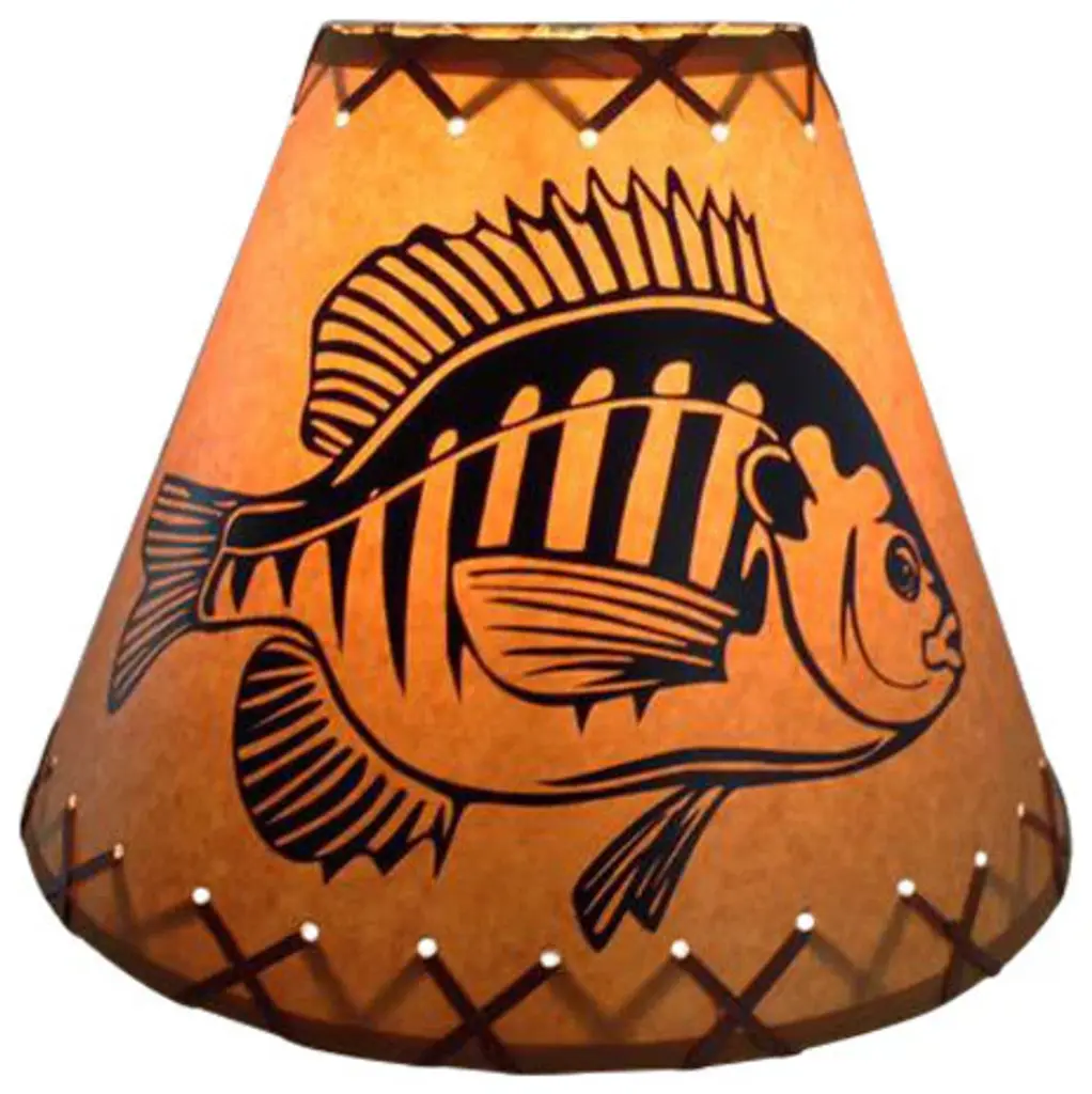 Faux oil kraft laced lamp shade with lacing top and bottomThis rustic shade measures:5"(top)14"(bottom)10"(slant)This shade has standard brass-plated spider wire across the top that works with harp(lamp bracket) and finialNo bulbs included60 watt maxLEDOne bulb requiredUL listingSockets UL File E-136278Cords AU 703482Factory ID L114949G7