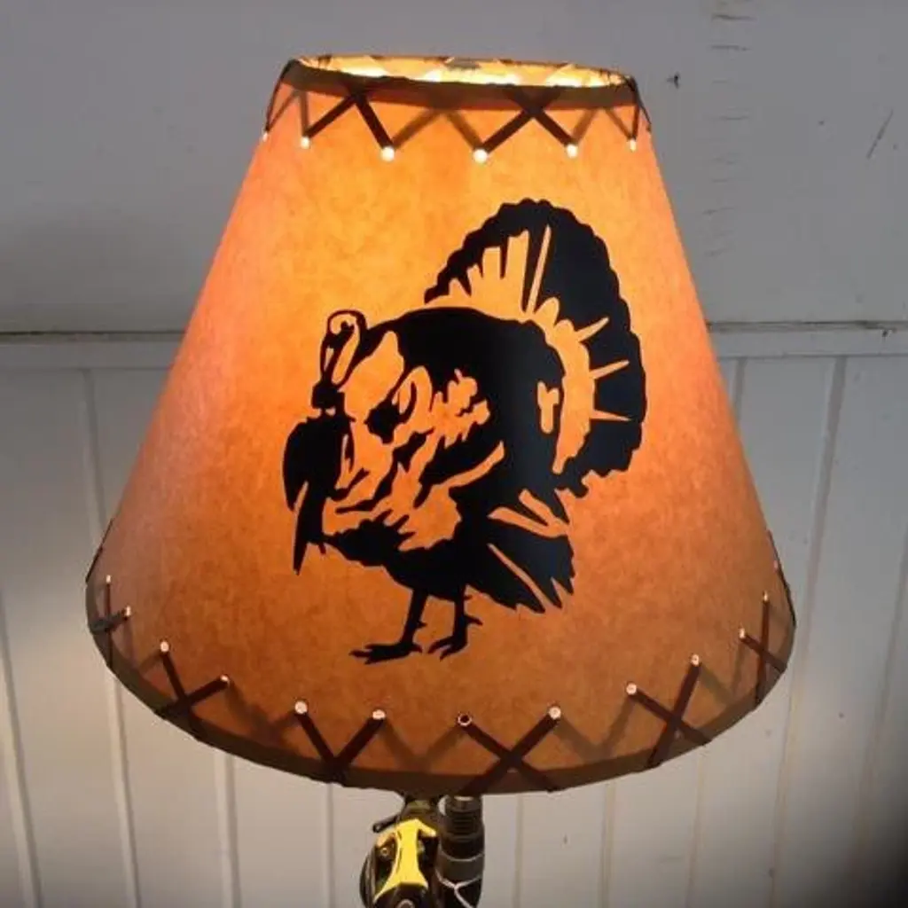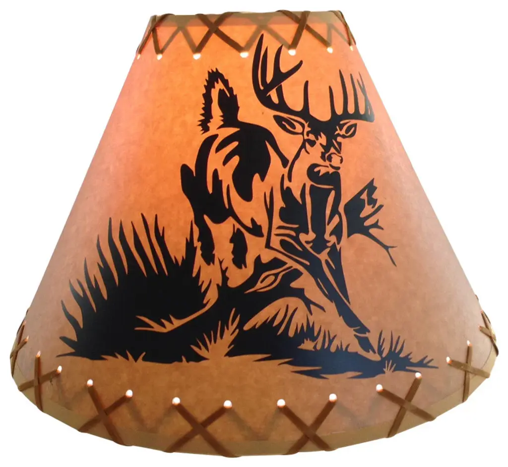 Faux oil kraft laced lamp shade with lacing top and bottomThis rustic shade measures:5"(top)14"(bottom)10"(slant)This shade has standard brass-plated spider wire across the top that works with harp(lamp bracket) and finialNo bulbs included60 watt maxLEDOne bulb requiredUL listingSockets UL File E-136278Cords AU 703482Factory ID L114949G23