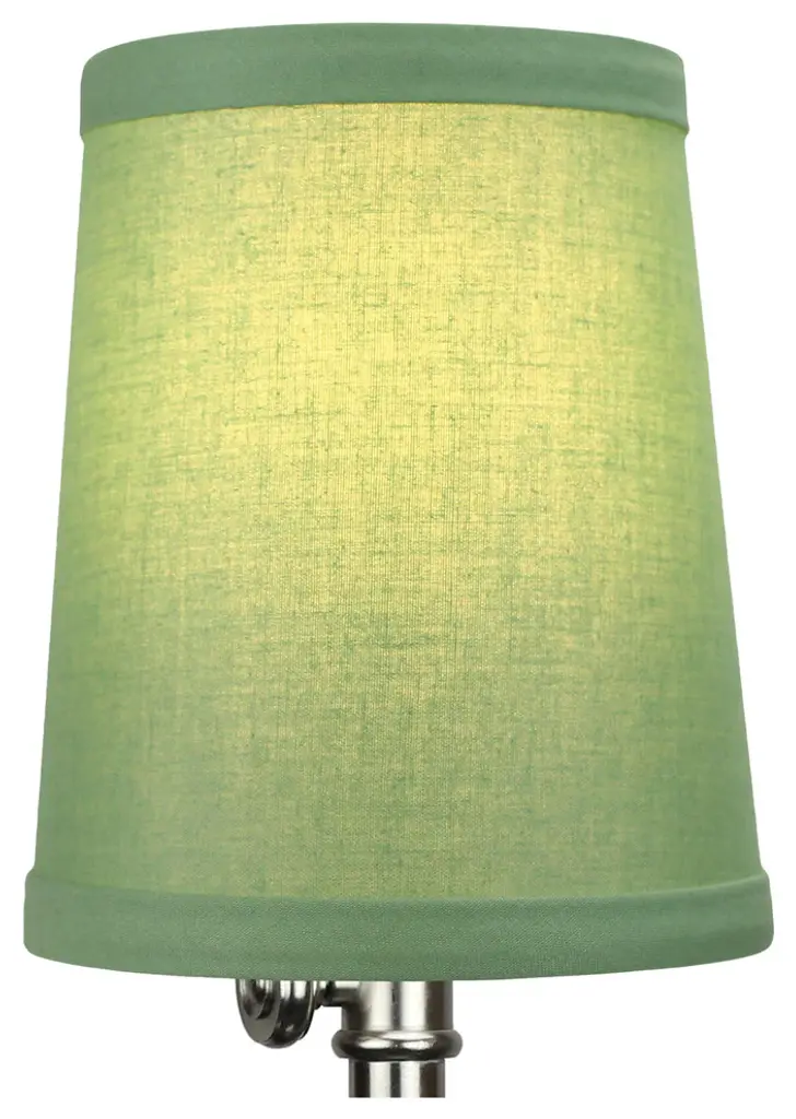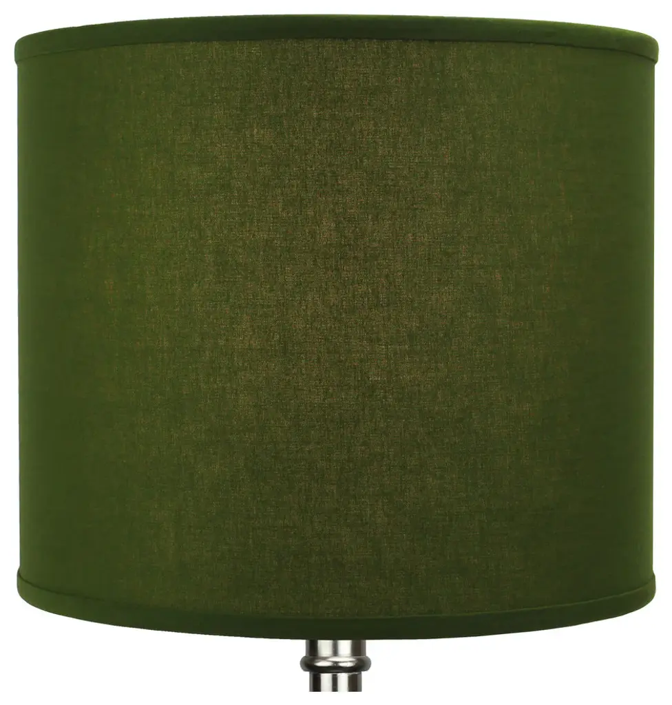 This lampshade is a hardback French drum. The lampshade measures 12" across the top, 14" across the bottom, and 10" overall height. The lampshade is fitted with a nickel spider fitter. The suede fabric is kelly green-colored. Maximum recommended wattage is 150 watts. Bulb not included.