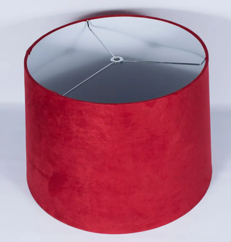 Our suede lamp shades add a cozy and unique look to your space. The shade measures 14" across the top, 16" across the bottom, and 11" overall height. Maximum recommended wattage is 150 watts.Nickel spider fitter; finial and harp not included.