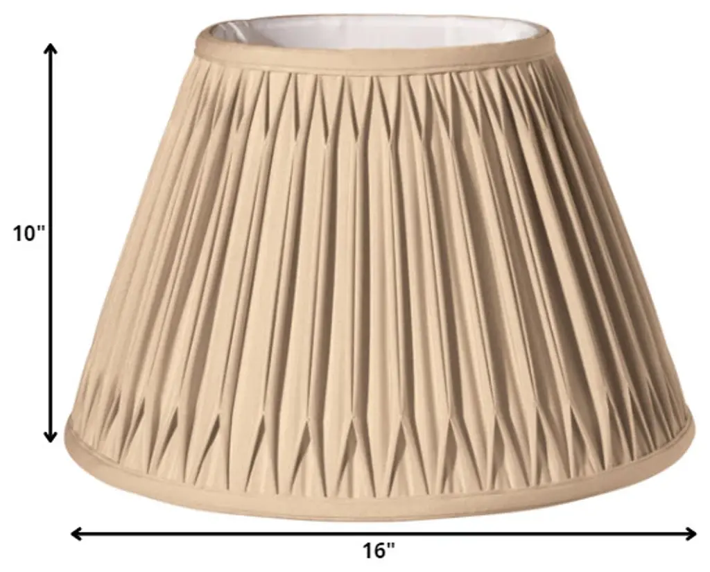 This 16" Vintage Gold Slanted Bell Smocked Shantung Lampshade has a hint of traditional flair and will be a great addition to your lamp base. This bell double smocked pleat softback lampshade includes a washer fitter that fits over a standard harp and can be used with your existing finial design. This high quality crafted bell shape has a slight slant to give it some visual interest and is crafted of the finest shantung with a fold on top and bottom of the shade. 10" x 16" x 16"