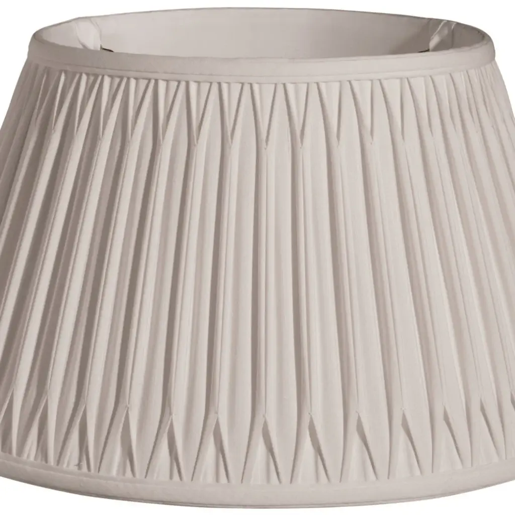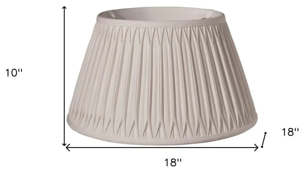 This 18" Cream Shallow Drum Smocked Shantung Lampshade has a hint of traditional flair and will be a great addition to your lamp base. This drum with double smocked pleat softback lampshade includes a washer fitter that fits over a standard harp and can be used with your existing finial design. This high quality crafted drum shape has a slight slant to give it some visual interest and is crafted of the finest shantung with a fold on top and bottom of the shade. 10" x 18" x 18"