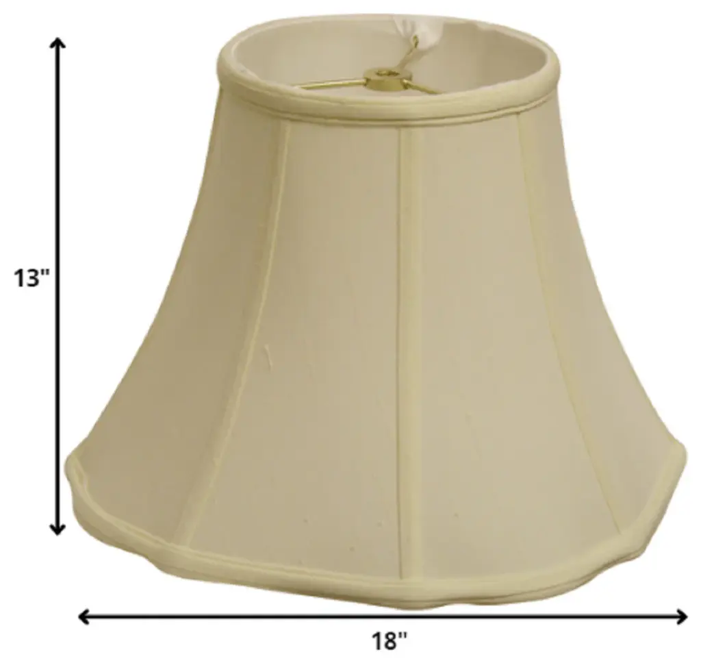 This Ivory Octagon Monay Shantung Lampshade has a hint of farmhouse flair and will be a great addition to your lamp base. This softback lampshade includes a standard washer fitter that fits over a standard harp and can be used with your existing finial design. This high quality crafted fancy octagon shaped has a slight slant to give it some visual interest and is crafted of the finest no monay shantung with a fold on top and bottom of the shade. 13" x 18" x 18"