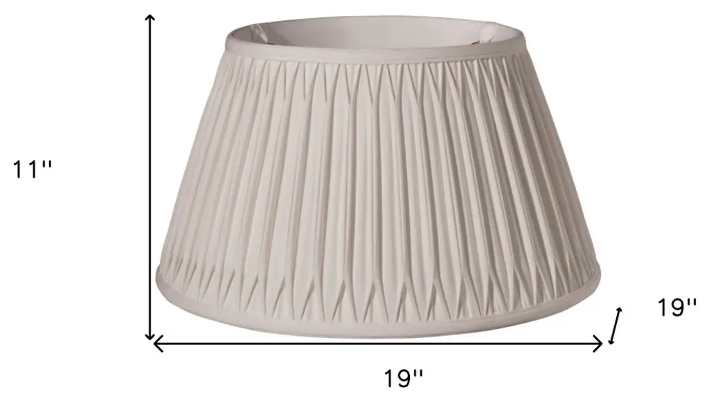 This 19" Cream Shallow Drum Smocked Shantung Lampshade has a hint of traditional flair and will be a great addition to your lamp base. This drum with double smocked pleat softback lampshade includes a washer fitter that fits over a standard harp and can be used with your existing finial design. This high quality crafted drum shape has a slight slant to give it some visual interest and is crafted of the finest shantung with a fold on top and bottom of the shade. 11" x 19" x 19"