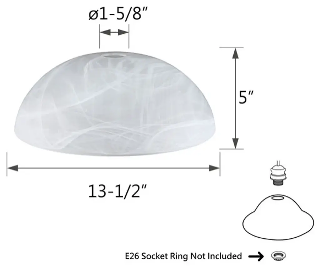 Aspen Creative is dedicated to offering a wide assortment of attractive and well-priced portable lamps, kitchen pendants, vanity wall fixtures, outdoor lighting fixtures, lamp shades, and lamp accessories. We have in-house designers that follow current trends and develop cool new products to meet those trends. Product Detail• Etched Alabaster colored replacement glass• 5" hight x 13-1/2" diameter• Our replacement glass shades can be used on an assortment of Torchiere Lamp, Swag Lamp and Pendant• Upgrade and / or change the look for your fixtures with an easy to glass changeAspen Creative Item 23133-11A