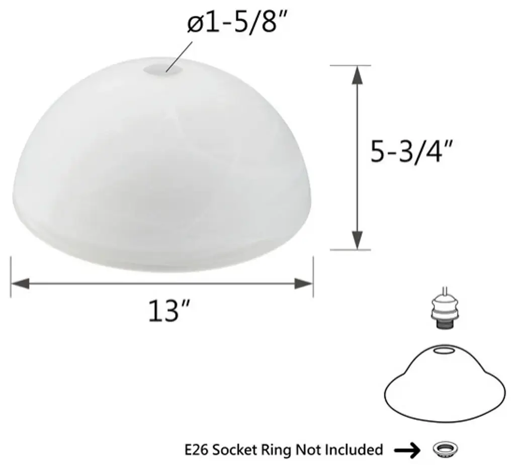Aspen Creative is dedicated to offering a wide assortment of attractive and well-priced portable lamps, kitchen pendants, vanity wall fixtures, outdoor lighting fixtures, lamp shades, and lamp accessories. We have in-house designers that follow current trends and develop cool new products to meet those trends. Product Detail• Alabaster colored replacement glass• 5-3/4" hight x 13" diameter• Our replacement glass shades can be used on an assortment of Torchiere Lamp, Swag Lamp and Pendant• Upgrade and / or change the look for your fixtures with an easy to glass changeAspen Creative Item 23516-21