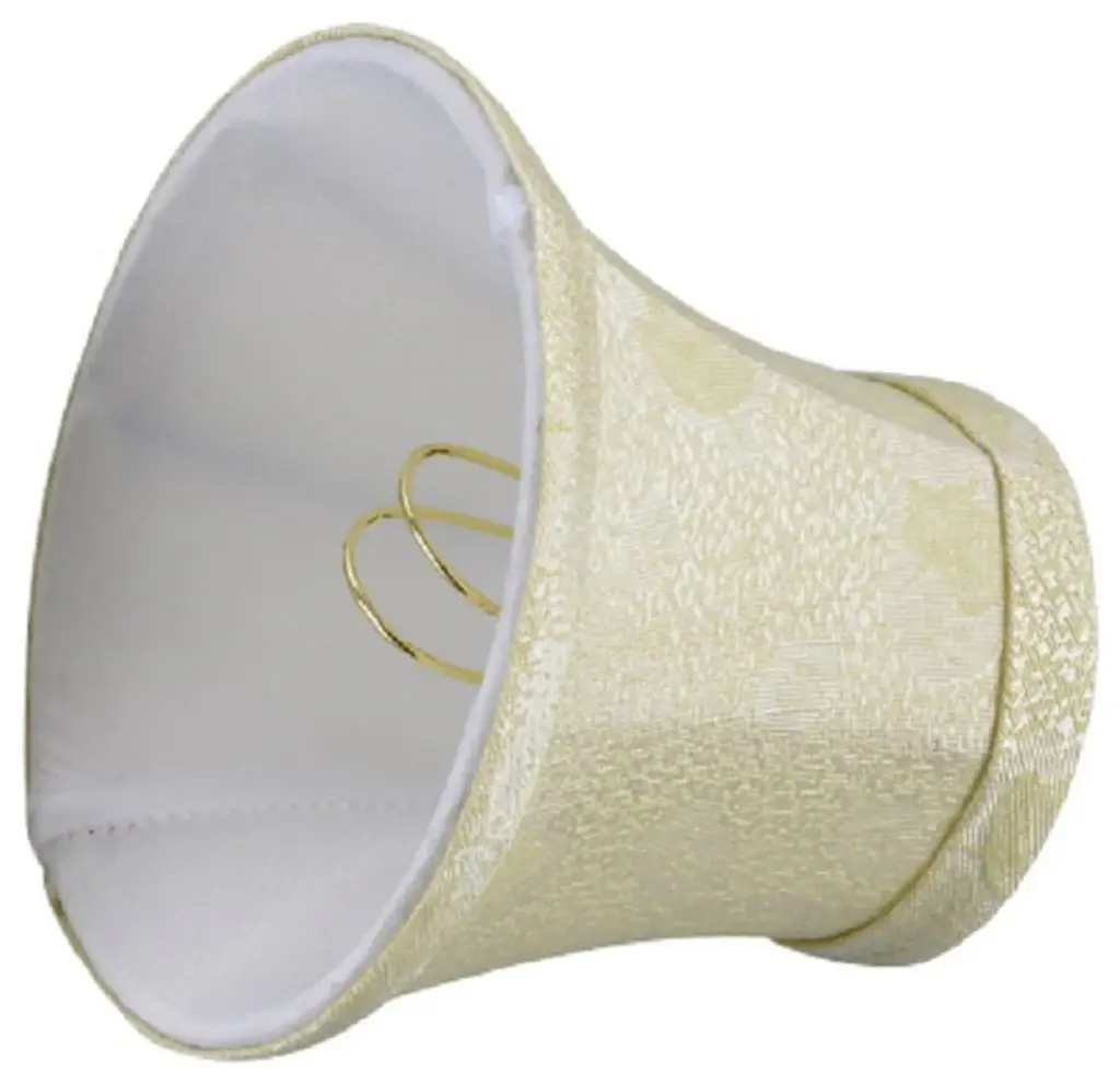 Aspen Creative is dedicated to offering a wide assortment of attractive and well-priced portable lamps, kitchen pendants, vanity wall fixtures, outdoor lighting fixtures, lamp shades, and lamp accessories. We have in-house designers that follow current trends and develop cool new products to meet those trends. Product Detail• Bell Shape Transitional (Mini Chandelier Lamp Shades) in Butter creme• Bell (clip on) Replacement Shade | Jacquard Textured Fabric with Pumpkin Leaf Design and Trim• Clip-on style fitter designed for bare Torpedo chandelier bulbs (bend tip bulbs not recommended) either in candelabra base (E12) or medium base (E26), light bulbs not included• Clip On Lamp Shade Dimensions: 3" top x 5" bottom x 4" slant height