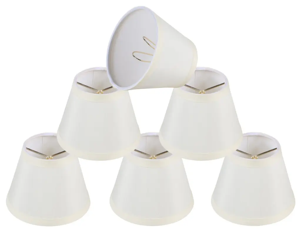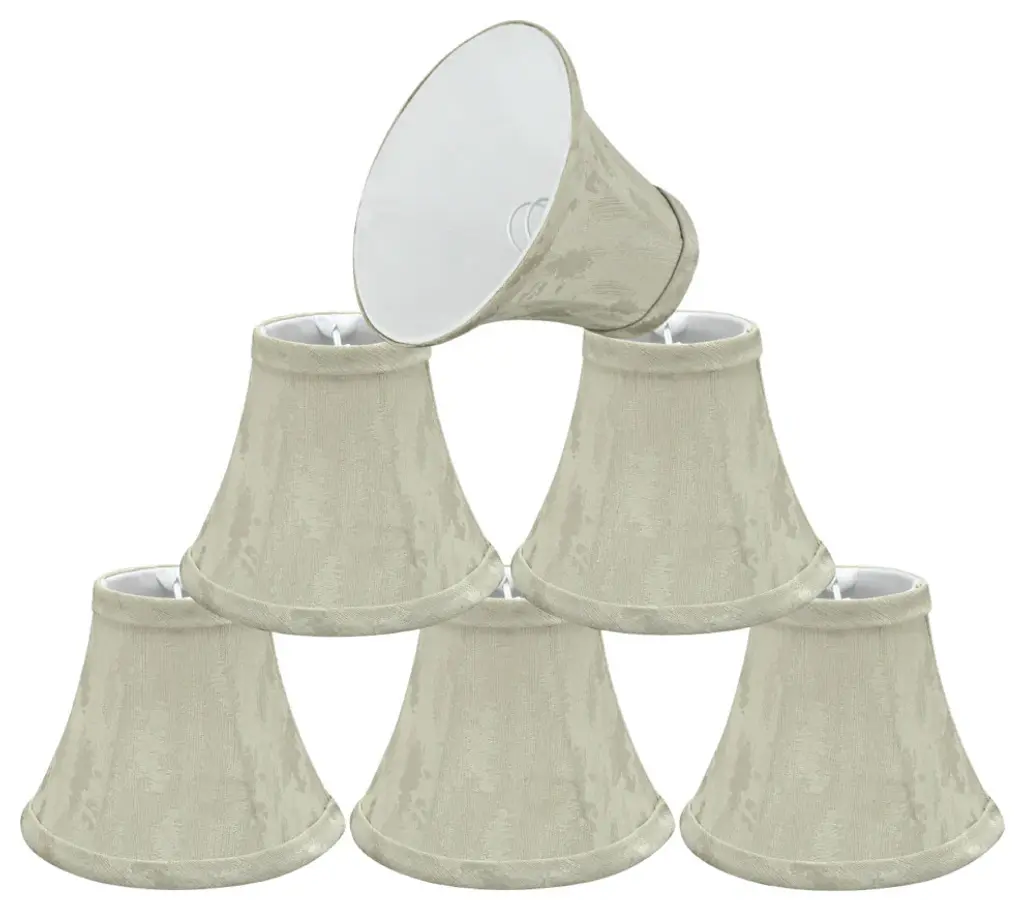 Aspen Creative is dedicated to offering a wide assortment of attractive and well-priced portable lamps, kitchen pendants, vanity wall fixtures, outdoor lighting fixtures, lamp shades, and lamp accessories. We have in-house designers that follow current trends and develop cool new products to meet those trends. Product Detail• Bell Shape Transitional (Mini Chandelier Lamp Shades) in Butter creme• Bell (clip on) Replacement Shade | Jacquard Textured Fabric and Trim• Clip-on style fitter designed for bare Torpedo chandelier bulbs (bend tip bulbs not recommended) either in candelabra base (E12) or medium base (E26), light bulbs not included• Clip On Lamp Shade Dimensions: 3" top x 6" bottom x 5" slant height
