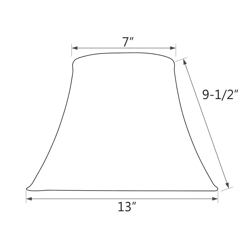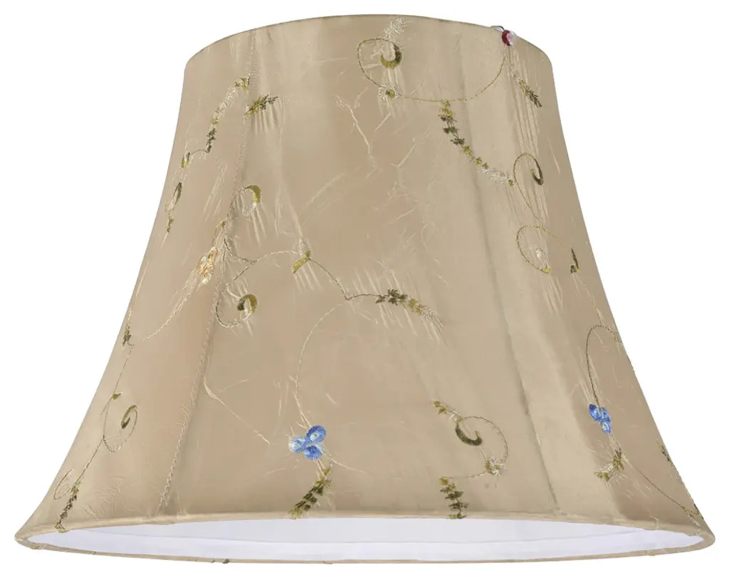 Aspen Creative is dedicated to offering a wide assortment of attractive and well-priced portable lamps, kitchen pendants, vanity wall fixtures, outdoor lighting fixtures, lamp shades, and lamp accessories. We have in-house designers that follow current trends and develop cool new products to meet those trends. Product Detail• 1 pack transitional bell replacement lamp shade• faux silk fabric with floral embroidered design (flowers vary in color from item to item) in gold | 7" top x 13" bottom x 9 1/2" slant height• Spider construction lamp shade, designed to attach to lamp harp• Applications - For table lamps, accent lamps, vintage lamps, candle stick lamps and kid''s room lamps