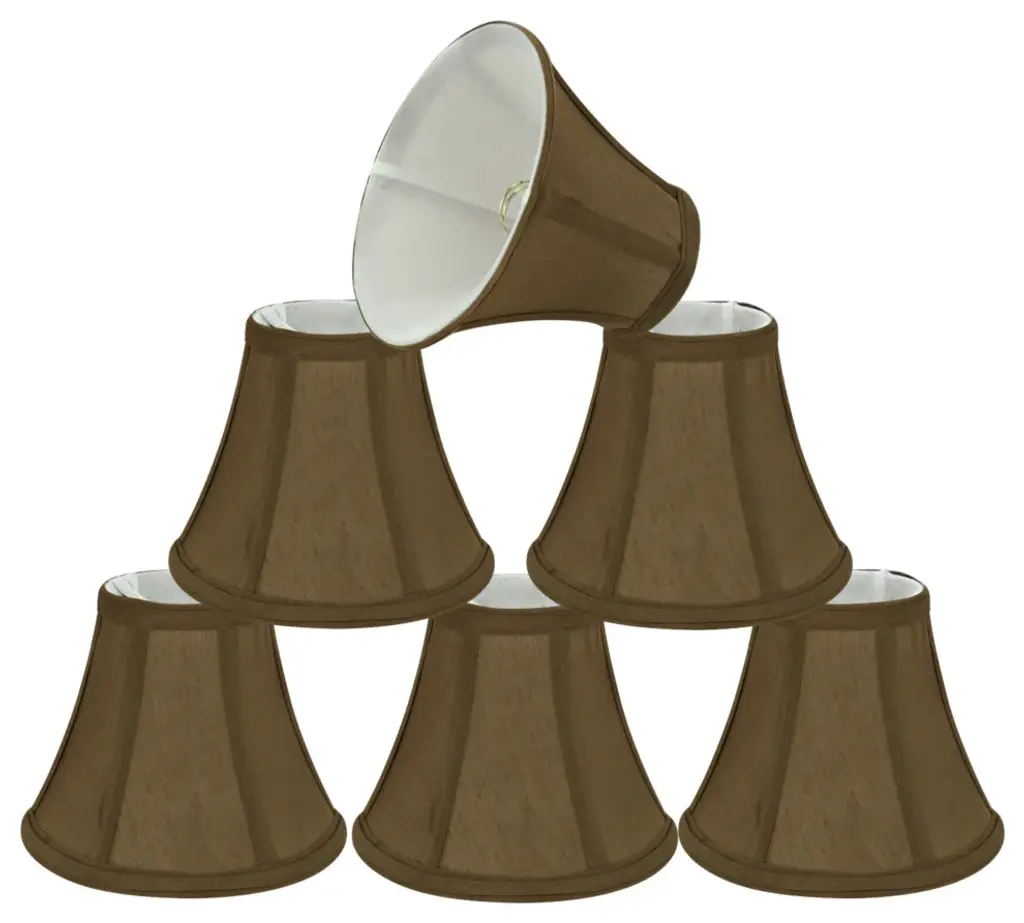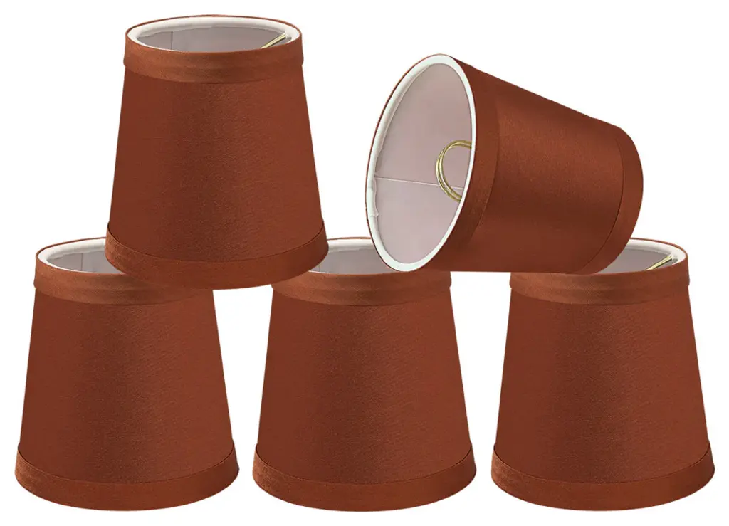 Aspen Creative is dedicated to offering a wide assortment of attractive and well-priced portable lamps, kitchen pendants, vanity wall fixtures, outdoor lighting fixtures, lamp shades, and lamp accessories. We have in-house designers that follow current trends and develop cool new products to meet those trends. Product Detail• Bell Shape Transitional (Mini Chandelier Lamp Shades) in Rust• Bell (clip on) Replacement Shade | Faux Silk fabric• Clip-on style fitter designed for bare Torpedo chandelier bulbs (bend tip bulbs not recommended) either in candelabra base (E12) or medium base (E26), light bulbs not included• Clip On Lamp Shade Dimensions: 3" top x 6" bottom x 5" slant height
