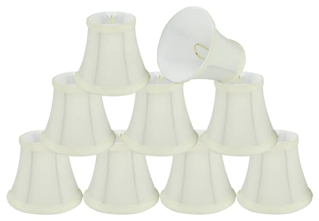 Aspen Creative is dedicated to offering a wide assortment of attractive and well-priced portable lamps, kitchen pendants, vanity wall fixtures, outdoor lighting fixtures, lamp shades, and lamp accessories. We have in-house designers that follow current trends and develop cool new products to meet those trends. Product Detail• Bell Shape Transitional (Mini Chandelier Lamp Shades) in Ivory• Bell (clip on) Replacement Shade | Faux Silk Fabric• Clip-on style fitter designed for bare Torpedo chandelier bulbs (bend tip bulbs not recommended) either in candelabra base (E12) or medium base (E26), light bulbs not included• Clip On Lamp Shade Dimensions: 4" top x 6" bottom x 5" slant height