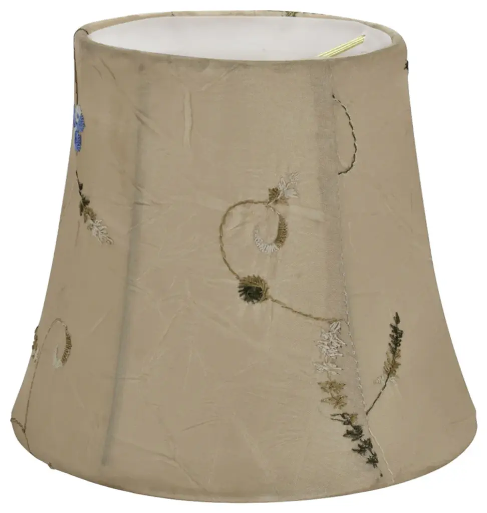 Aspen Creative is dedicated to offering a wide assortment of attractive and well-priced portable lamps, kitchen pendants, vanity wall fixtures, outdoor lighting fixtures, lamp shades, and lamp accessories. We have in-house designers that follow current trends and develop cool new products to meet those trends. Product Detail• Bell Shape Transitional (Mini Chandelier Lamp Shades) in Gold• Bell (clip on) Replacement Shade | Faux silk fabric with floral embroidered design• Clip-on style fitter designed for bare Torpedo chandelier bulbs (bend tip bulbs not recommended) either in candelabra base (E12) or medium base (E26), light bulbs not included• Clip On Lamp Shade Dimensions: 4" top x 6" bottom x 5" slant height