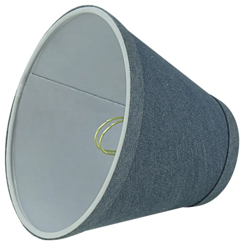 Aspen Creative is dedicated to offering a wide assortment of attractive and well-priced portable lamps, kitchen pendants, vanity wall fixtures, outdoor lighting fixtures, lamp shades, and lamp accessories. We have in-house designers that follow current trends and develop cool new products to meet those trends. Product Detail• Hardback Empire Shape Transitional (Mini Chandelier Lamp Shades) in Washing Blue• Hardback Empire (clip on) Replacement Shade | Denim Fabric• Clip-on style fitter designed for bare Torpedo chandelier bulbs (bend tip bulbs not recommended) either in candelabra base (E12) or medium base (E26), light bulbs not included• Clip On Lamp Shade Dimensions: 3" top x 6" bottom x 5" slant height