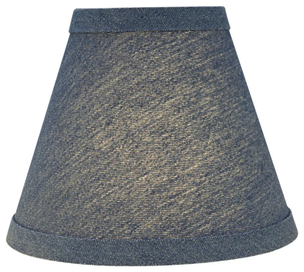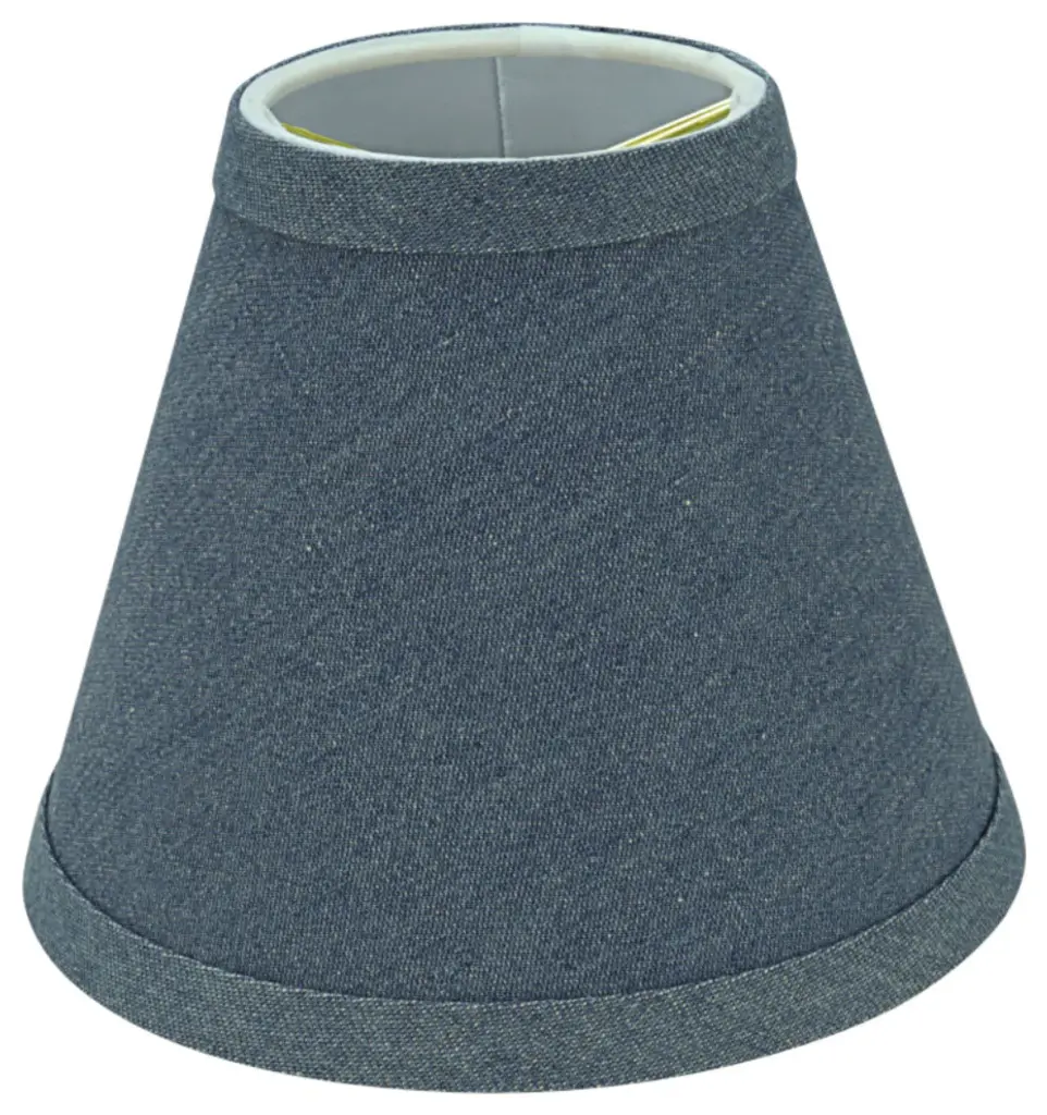 Aspen Creative is dedicated to offering a wide assortment of attractive and well-priced portable lamps, kitchen pendants, vanity wall fixtures, outdoor lighting fixtures, lamp shades, and lamp accessories. We have in-house designers that follow current trends and develop cool new products to meet those trends. Product Detail• Hardback Empire Shape Transitional (Mini Chandelier Lamp Shades) in Washing Blue• Hardback Empire (clip on) Replacement Shade | Denim Fabric• Clip-on style fitter designed for bare Torpedo chandelier bulbs (bend tip bulbs not recommended) either in candelabra base (E12) or medium base (E26), light bulbs not included• Clip On Lamp Shade Dimensions: 3" top x 6" bottom x 5" slant height