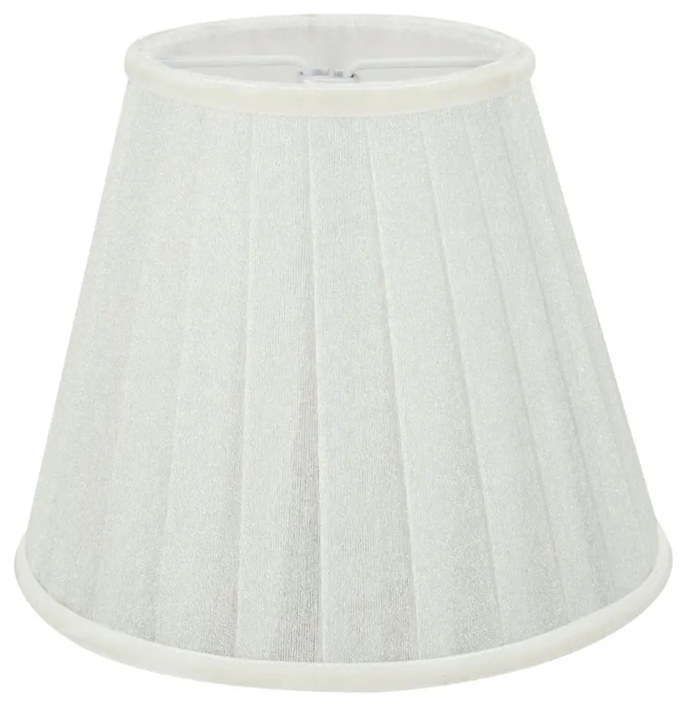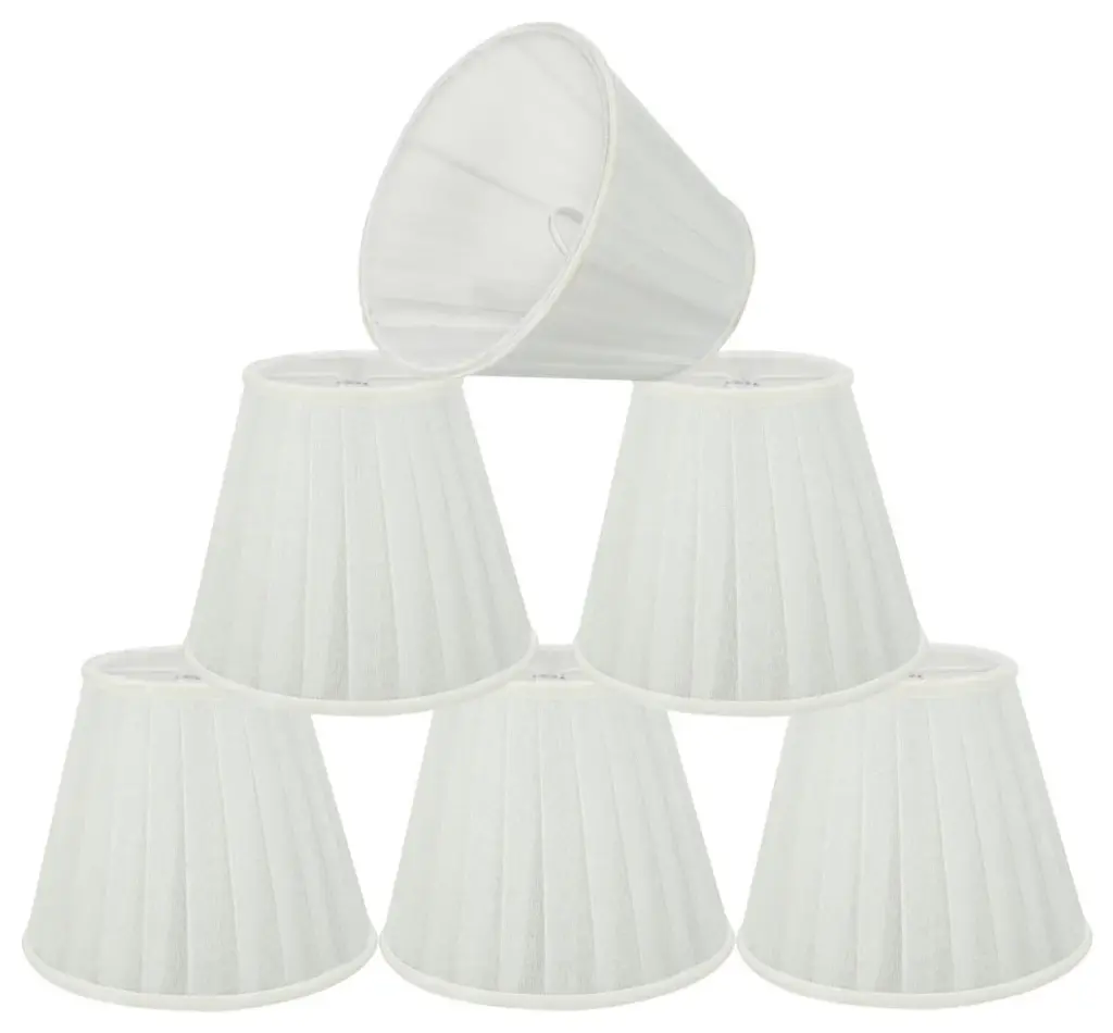 Aspen Creative is dedicated to offering a wide assortment of attractive and well-priced portable lamps, kitchen pendants, vanity wall fixtures, outdoor lighting fixtures, lamp shades, and lamp accessories. We have in-house designers that follow current trends and develop cool new products to meet those trends. Product Detail• Pleated Empire Shape Transitional (Mini Chandelier Lamp Shades) in White• Pleated Empire (clip on) Replacement Shade | Crystal Yarn Fabric• Clip-on style fitter designed for bare Torpedo chandelier bulbs (bend tip bulbs not recommended) either in candelabra base (E12) or medium base (E26), light bulbs not included• Clip On Lamp Shade Dimensions: 3" top x 5" bottom x 4 1/4" slant height